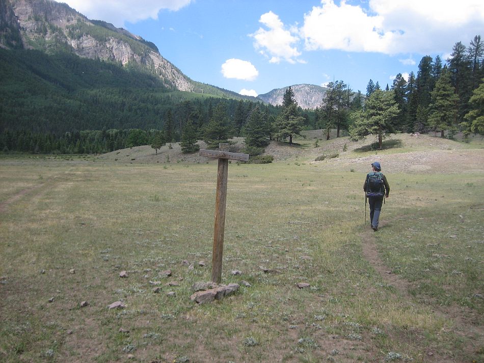 At SJ-05 (5.9 miles), Trail 726 takes off to the south, crosses the South Fork and heads up Canon Verde. There are several good campsites here, one in the upper meadow south of the junction and another next to some trees down by the creek. The loop continues west on Trail 724. Although there was a sign pointing the way, the path was over grown making it look like the trail might have been re-routed. That was not the case, it was just over grown. Future hikers may not have the benefit of the sign because it was dangling half off the post.
