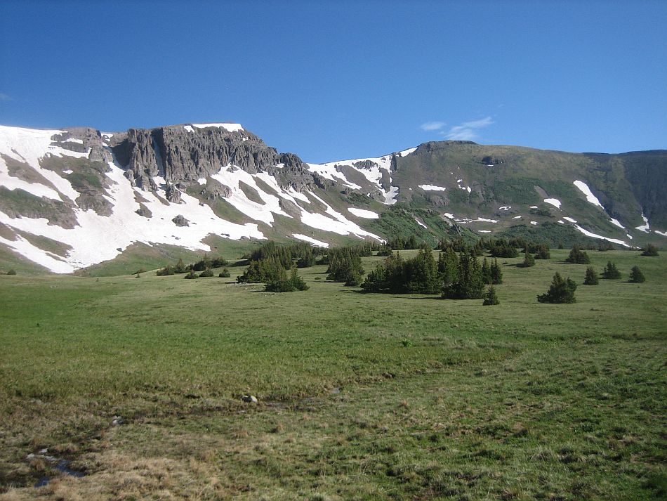 Go down hill cross the creek and head up towards the break in the trees on the next ridge. There is not much of a path so look for cairns and blazes. Pick up the path in the woods and lose it again in the next meadow as you pass to the left of a small pond. Back to the woods again and then out as you switch back down a small talus slope and into an isolated meadow (16.6 miles). The trails heads back into the woods at the southeast corner of the meadow. It was not readily apparent at first because there were a lot of downed trees and snow patches masking it. Look for the tree blazes.