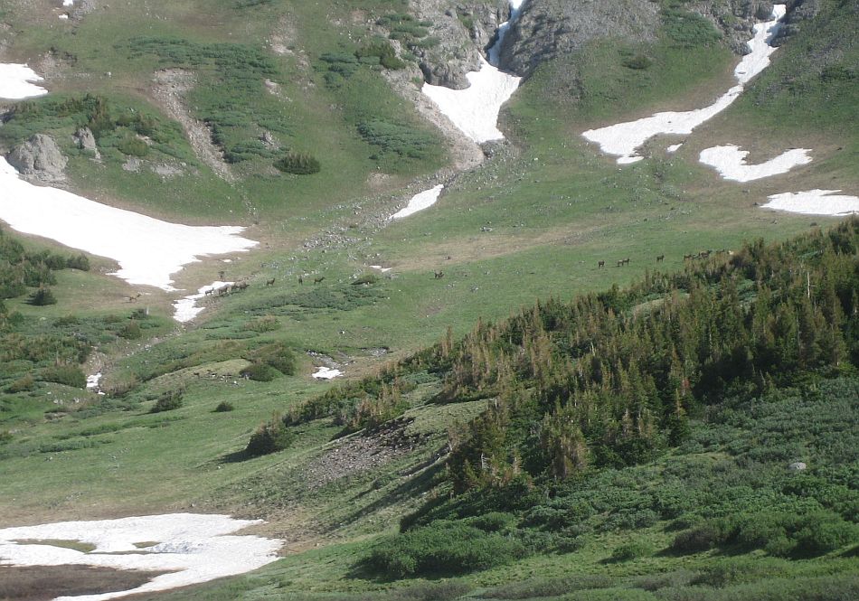SJ-07 is in a huge alpine meadow and is the junction of four trails. The Glacier Lake trail heads west, crosses the Canon Rincon and switch backs up the cliff to Glacier Lake. Going southeast is the trail to Timber Lake. There is another trail to the west Twin Lake, but it wasn’t very apparent in the meadow. The same is true for the fourth trail, our trail (722), which goes north past the east side of the east Twin Lake. We found a great campsite (video) up the hill from the junction that would have provided shelter if to stormed again and some excellent views (video). This where we began seeing the elk herds.