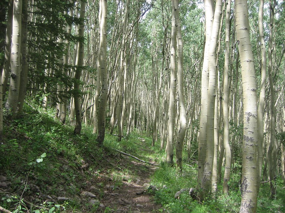 Now the switchbacks begin dropping 2300 feet over the next 4.5 miles. The first and smaller set end at a long meadow that follows the upper reaches of Roaring Gulch. There is a small creek side campsite right next to the crossing at the upper end of the meadow. After the junction with the trail to Bear Lake (SJ-12, 18.3 miles) the switchbacks continue in long descending legs. The aspens forests in this area were magical. The trails passes through another gate at 20.8 miles (SJ-13) and closes the loop back at SJ-3 at mile 21.2. The last mile takes you back to the bridge and uphill past the cabin to the trailhead.