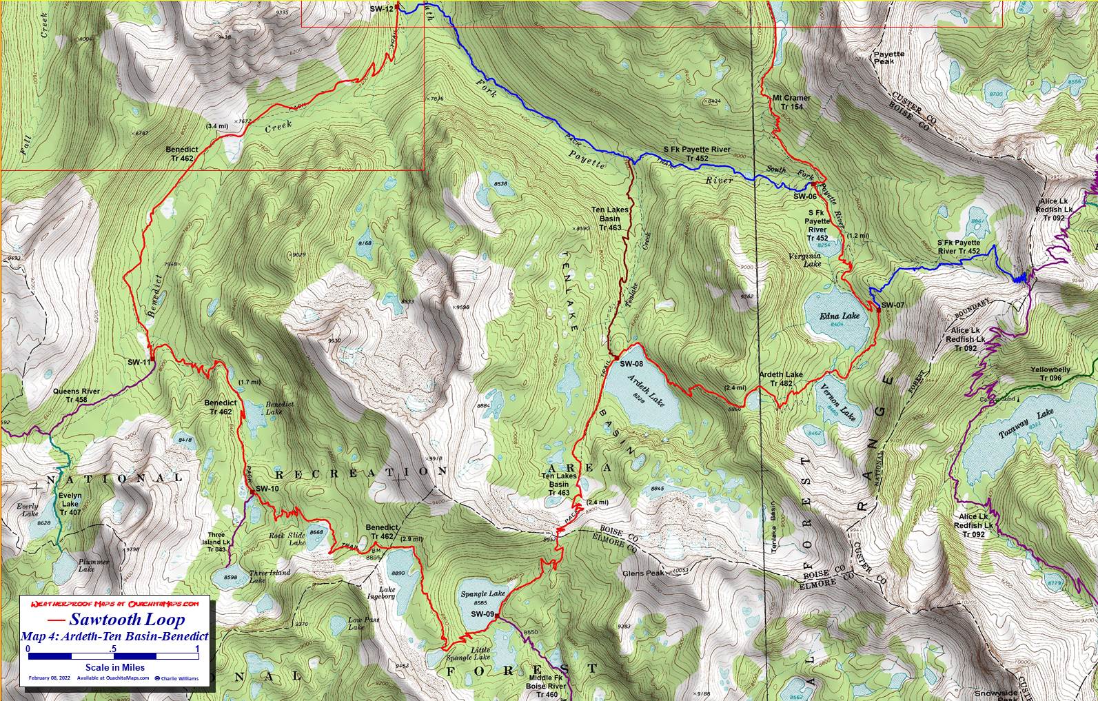 Map 4: Ardeth-Ten Basin-Benedict. The Mt Cramer Trail leaves Hidden Lake and switchbacks down to the SW-06 in the valley of the South Fork of the Payette River. SW-06 is 36.6 miles into the loop. The loop turns south-southeast (left) and follows the S Fk Payette River Trail (452. The trail is blue on the map but where it coincides with the loop, the red loop line makes it purple). Turning west (right) at the junction will lead to SW-12 in 3 miles, cutting 14 miles off from the loop.