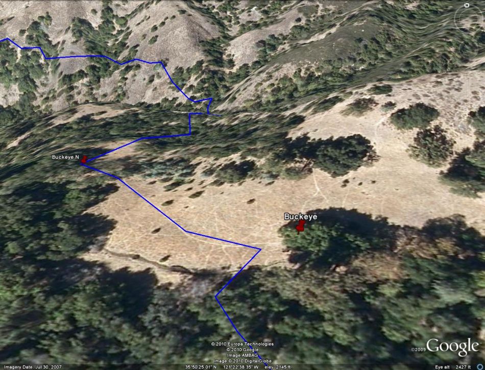 At the end of the ascent, you will cross the nose of a ridge. The next mile is pretty level as the trail contours around the mountain side to Buckeye Camp. The main Buckeye Camp (mile 16.4) is under a huge broad leaf tree next to a fairly large meadow (video). You will see two trails leaving the camp. One heads north west across the meadow, crosses a broken barbed wire fence, climbs over a small ridge and peters out. The one that goes northwest across the meadow it the trail. A tenth of a mile further is a second Buckeye campsite. Just past it the trail goes into a ravine where we freshened up our water for the hike over the final ridge.