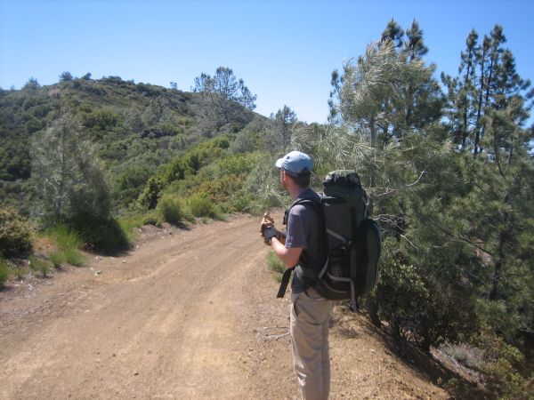 Once you reach the top of the ridge and intersect the trail to Silver Peak (mile 5.6), you are in the chaparral. There is a trail marker at the intersection; be sure you turn left (east). Going right will take you to Silver Peak. There is supposed to be a campsite near the peak, but we didn't go that way. Turn left and it is 0.4 miles to Lion Den on an old eroded forest road. The brush has not closed up this part of the trail and most of the PO disappears (though there is a bit on the trail near Lion Den).