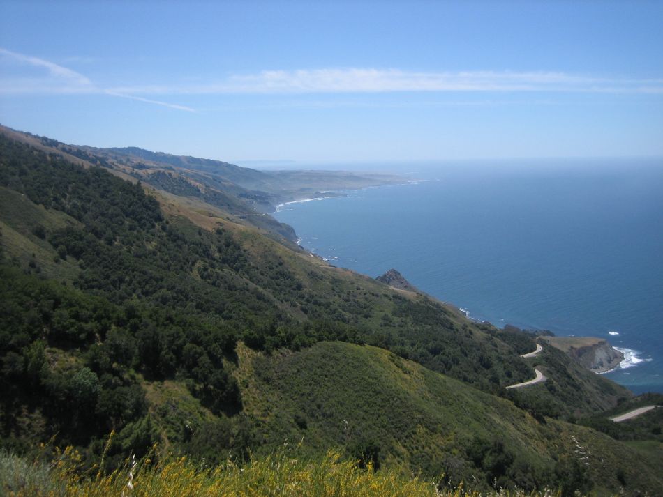 Background: Established in 1992, the Silver Peak Wilderness encompasses 31,555 acres at the southern end of the northern division of the Los Padres National Forest. The western border is scenic Highway 1 which in this area runs precariously on the bluffs climbing out of the Pacific Ocean. The Cruickshank Trailhead is so close to the ocean, you might be able to hit it with a rock if you have a good enough arm. The eastern boundary is the South Coast Ridge Road, which as its name implies, runs the crest of the Santa Lucia Range, about 6 miles inland.The wilderness has a diverse assemblage of vegetation. The mountains rising out of the sea begin as steep grassy hillsides. Between about 1,000 and 2,400 feet on these exposed slopes, the grasses give way to forest. In some of the saddles you might find the gray pine. In the major stream valleys such as Villa and Salmon Creeks, the forest is dense and predominately broadleaf (such as live oaks, bay laurels and maybe a red barked madrone) with a few redwood groves. This is the southern most occurrence of the redwoods. At higher elevations, the mixed forest gives way to chaparral with its sage, cypress bushes and sparse coulter pines with their huge and sharp pinecones. And then there are the flowers. When we were there Memorial Day weekend, we saw a dozen different flowers of all colors.