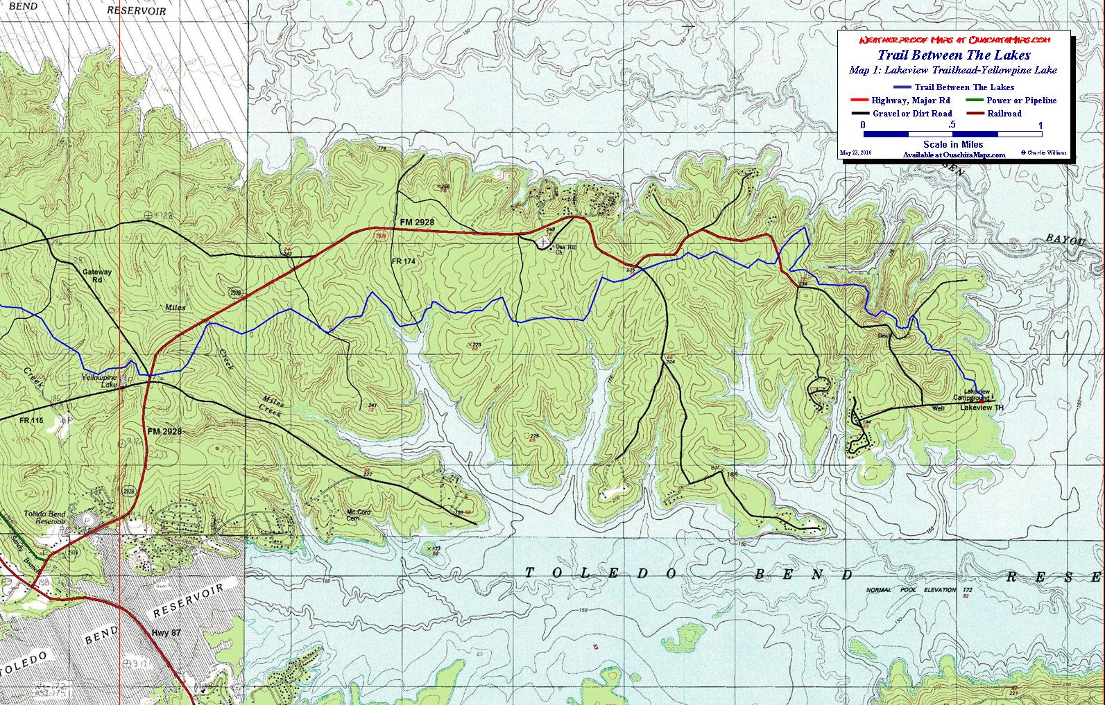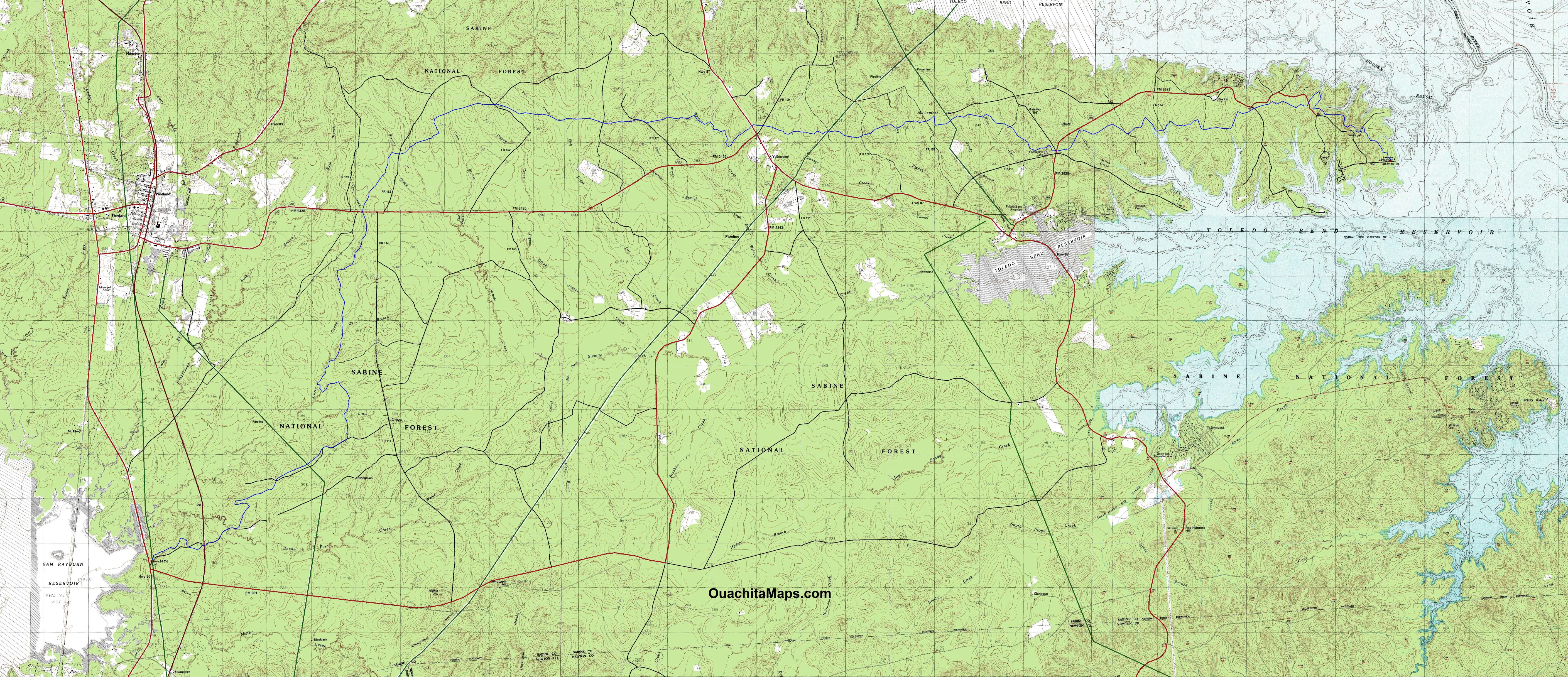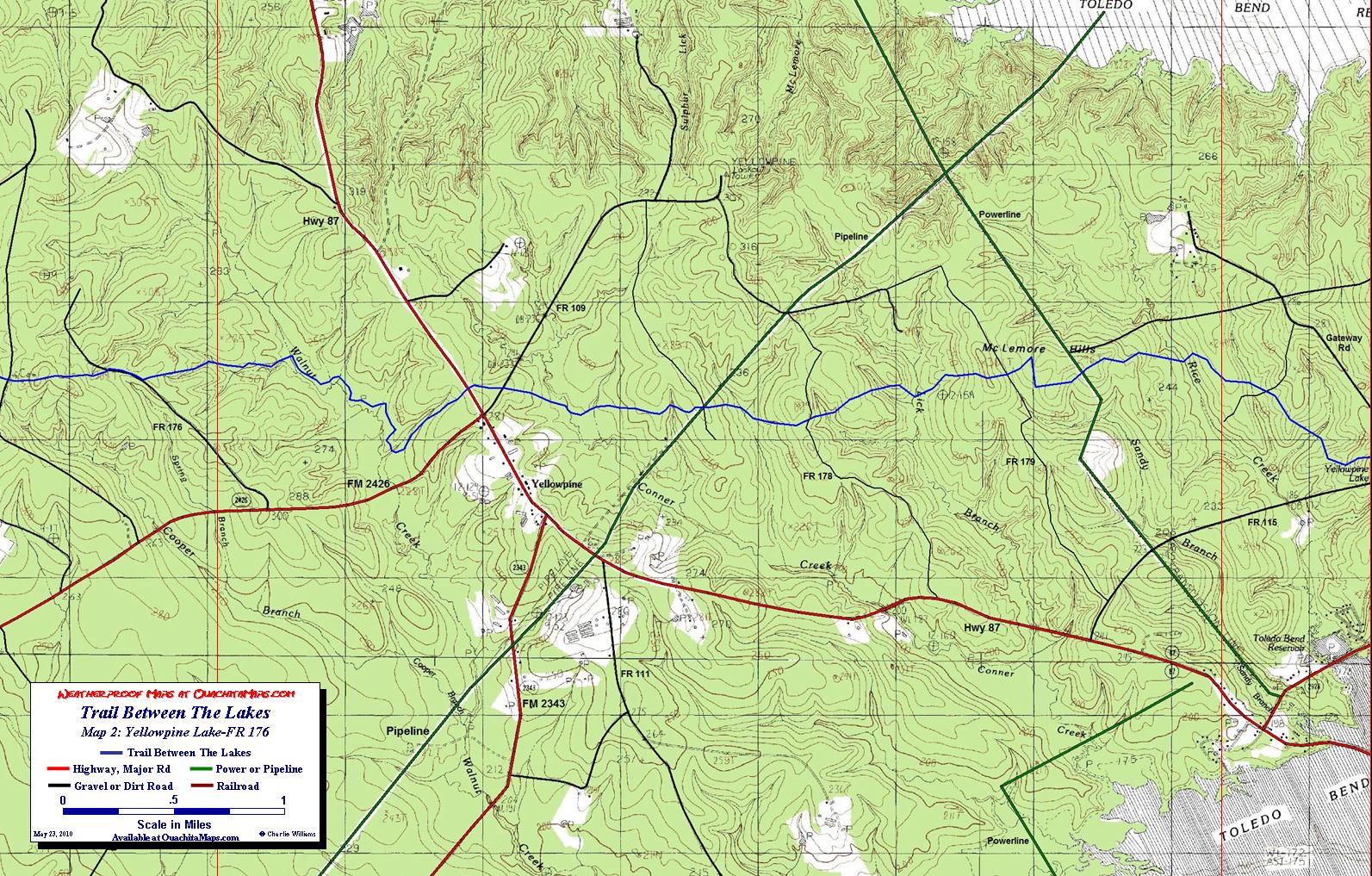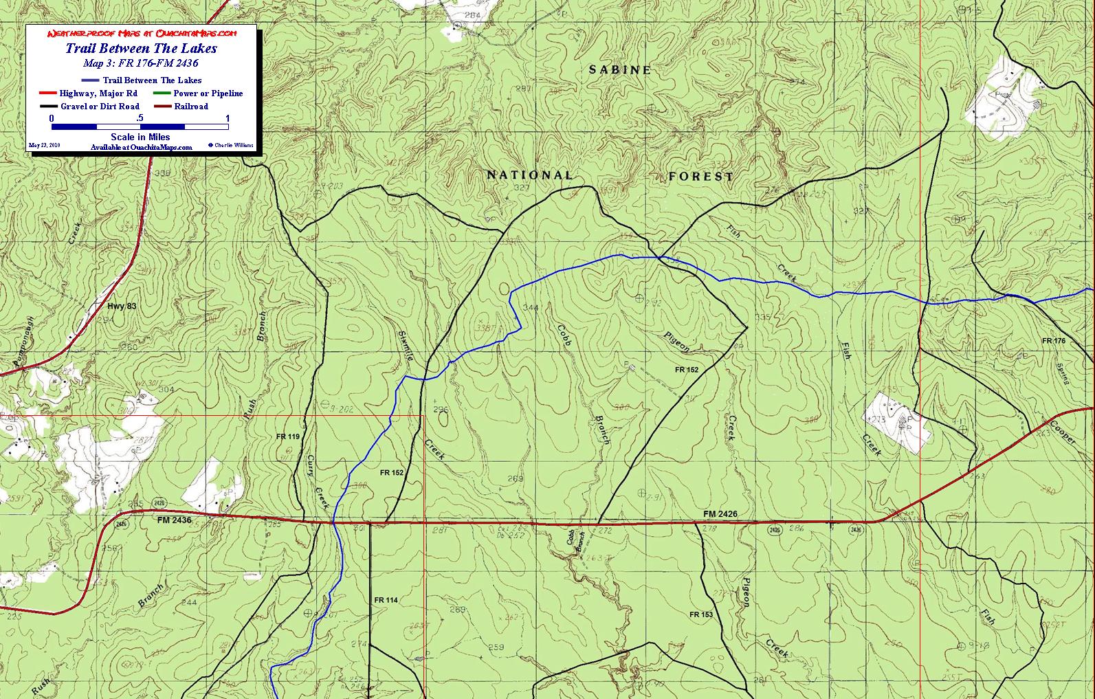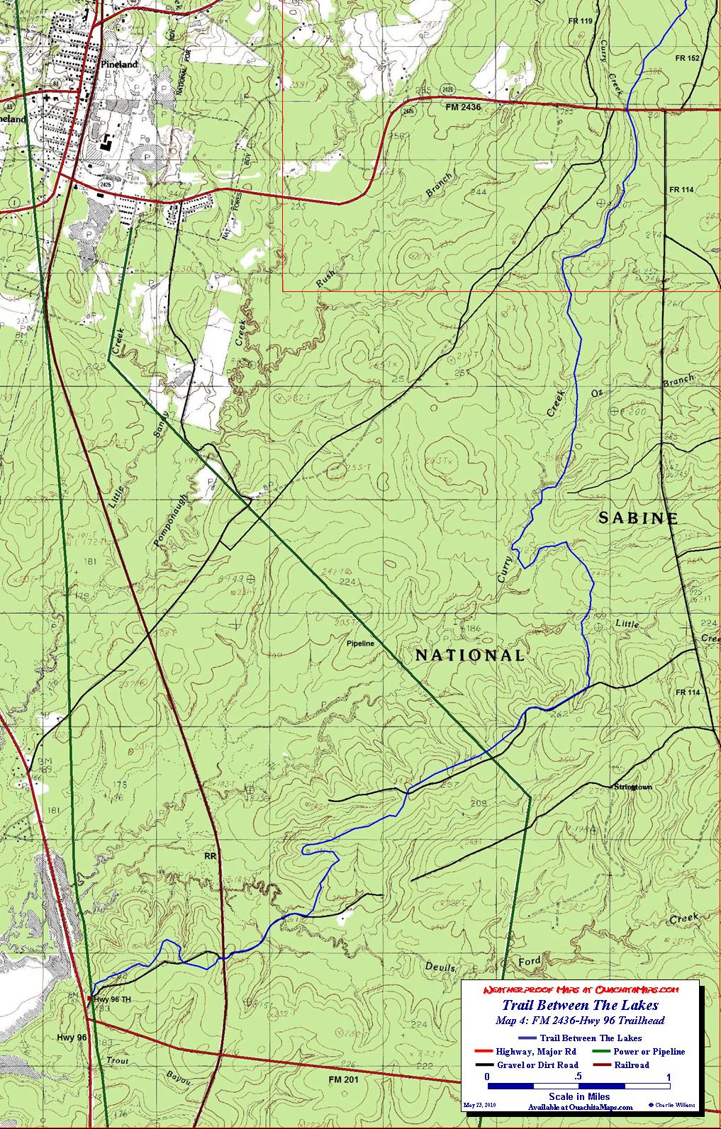 The other four maps are formatted to print on 11x17 paper. You can probably take these to your nearby copy shop and get them made for less than $2 a piece. Alternatively, it is available on 11x17 Rite in the Rain weatherproof paper for $5 per sheet by emailing cew5151@gmail.com ($5 per sheet or $20 for the set, plus S&H). All the maps are true 1:24,000 scale based on the USGS 7.5 minute quadrangles. The contour internal is 10 feet. The Trail Between The Lakes is shown in blue. While very serviceable, and better than anything else available, this is not my best work. The GPS track was taken in January 2004 and at the time I was using a commercial topo package. When I lost the C drive on my computer, I lost the original track. Luckily, I had sketched the trail on the topos and have since found a Forest Service track to fill in some gaps. I also have a series of maps done by BSA Troop 204 that is based on a track they took in 2001. I know there are some problems with that track because I had it on my hike and it misplaced some obvious land marks (might be a projection error). All of the maps have been enhanced. The highways and major Farm to Market roads are shown in red, other roads in black, power lines and pipelines in green and railroads in maroon. Google Earth was used to check the roads and add some lesser forest roads that don't appear on the topo. The roads have also been labeled.Trail Mileage. Click here for an Excel spreadsheet of the trail. There is an West to East and East to West version so it is ready to use regardless of your route. Since it is a "live" file you can sum your mileage to get a better idea of the length of your days. Check out column "C." By copying the formula in one of the cells to the beginning and ending location of a day and deleting the formulas in between, you can get subtotals. Feed back welcome! Background. Welcome to the Piney Woods of East Texas. This is home of the endangered red-cockaded woodpecker and eight other woodpecker species. As part of the Southern Tertiary Uplands eco-region, it is flat with a few small hills. The natural forest is longleaf pine with hardwoods such as hickory, oak, beech and magnolia. Before the massive pine harvests of the earlier centuries and 100 years of fire suppression, the understory of blue stem grasses created a park-like savanah. It was said that a rider could gallop his horse through the open forest. Not any more. While there are some areas where the historical ecology is coming back, most of the pines are now shortleaf or loblolly found in plantations and the understory is filled with bushes. While the trail is on national forest lands, there is plenty of evidence of civilization as the trail crosses many roads, pipelines and transmission line right of ways. The good news is that since the Forest Service does not recommend drinking the water (even if filtered), there are ample opportunities to cache water. If you are unfamiliar with this part of Texas, you will be pleasantly surprised with the mild weather that is typical of winter (IMO the best time to hike in East Texas). It should also be noted that the summer can be VERY hot and humid and quite uncomfortable if you aren't used to it. The Hike. We hiked this trail in January 2004, just about a year after the space shuttle Columbia disintegrated over East Texas. I bring this up because when we got to our hotel late Friday after our drive from Tulsa, we saw dozens of pictures of debris that had landed in the hotel parking lot. Our trip was from west to east, starting from the Hwy 96 trail head. We spent 2 nights on the trail taking a short day out so we have time to drive back to Oklahoma. Since this trip was before I started OuachitaMaps, I don't have any pictures from the trip. For details about the trail, I refer you to the Excel spreadsheet, the topos and this Google Earth track. All in all this is similar to the Lone Star and Four C hiking trails. The land is fairly level with only about 200 feet of relief between the high and low points on the trail. Pine trees dominate with some areas being fairly open and others with thick understory. In January, all the creek crossings were fordable. As noted above, the Forest Service recommends that you don't drink the water from the creeks or lakes, even if it is treated. Drinking East Texas trail water has been debated on the Lone Star Hiking Trail forum where many people who drink it claim no negative effects. We are used to caching water and with all the road crossings, this trip is very convenient. We dropped one car at Lakeview and dropped water on the way back to Hwy 96. What it cost in shuttle time, we made up by not having to pump or look for "good" water. Info: USGS 7.5 minute Quadrangles: Pineland North, Pineland South, Hemphill and Negreet SW. Sabine National Forest, 5050 Hwy 21 East, Hemphill TX 75948, Telephone: (409) 625-1940. Website: http://www.fs.fed.us/r8/texas/recreation/sabine/sabine_gen_info.shtml/. Direction: From Lufkin TX take Highway 103 east for 40 miles. Turn right (south) on Highway 96 and go 17 miles. Look for the sign for the trailhead. If you get to FM 201, you went about 0.1 miles too far. To Buy Map: This map is FREE. Click on images to access full size map and download it. Alternatively, it is available on 11x17 Rite in the Rain weatherproof paper for $5 per sheet by emailing cew5151@gmail.com($5 per sheet or $20 for the set, plus S&H). |