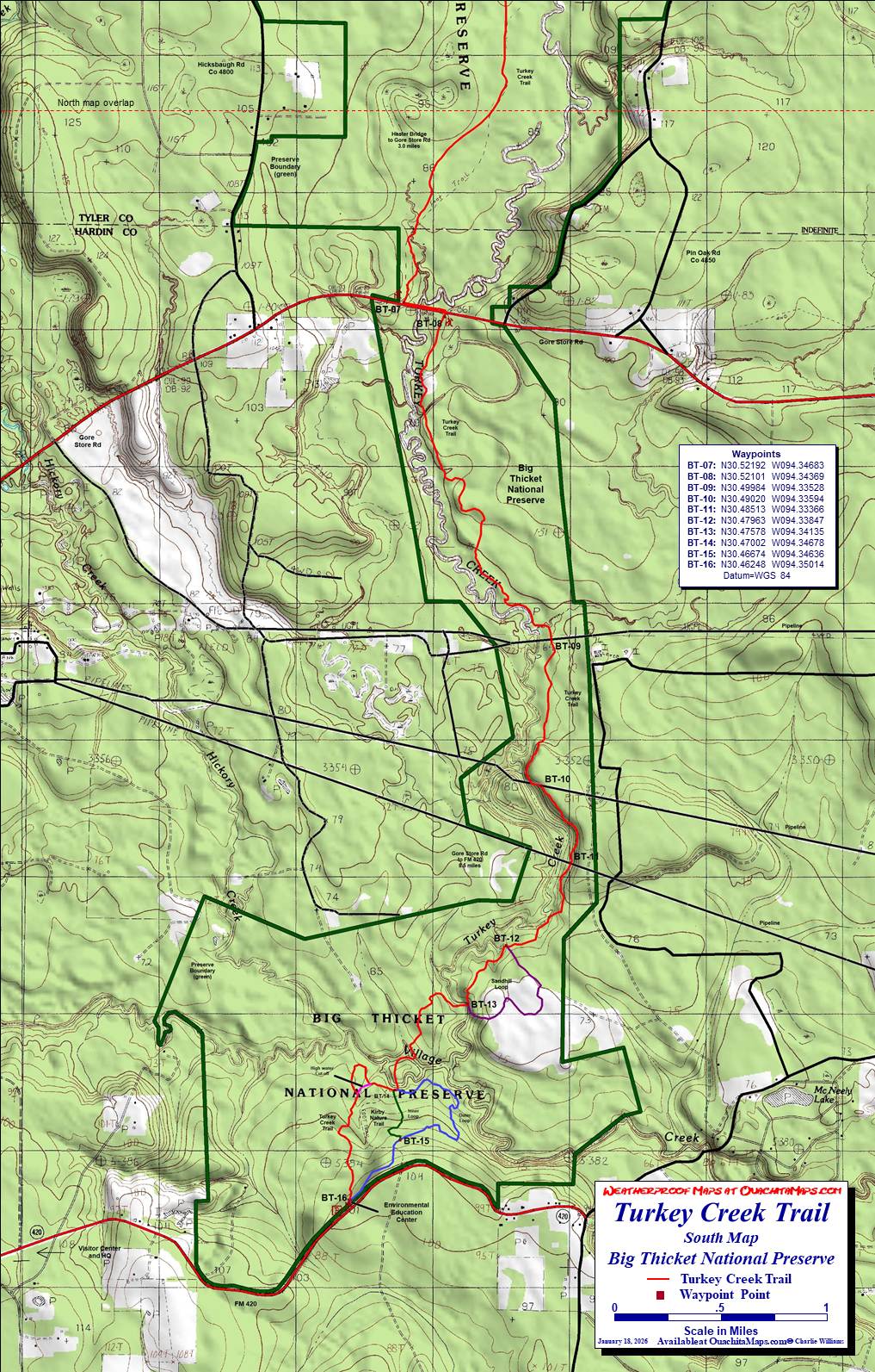 The Big Thicket National Preserve is 97,000 acres north of Beaumont Texas. It is disjointed and mostly follows a handful of bayous, creeks and rivers over a 6,000 square mile area. The Turkey Creek Trail is the longest trail, stretching 17.5 miles (15 miles by my GPS).