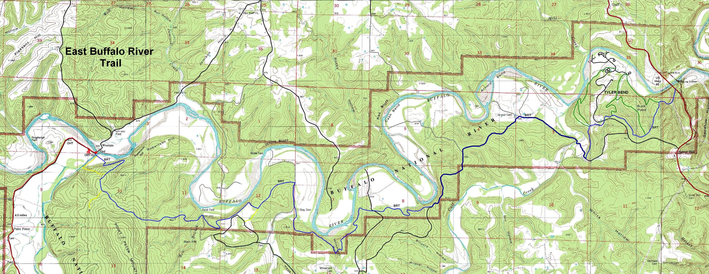 A little over two dozen river miles downstream from Pruitt abd tge east end of the Western BRT is the Eastern Section of the Buffalo River Trail (map). It begins at the Woolum ford, a popular canoe take-out and the end of the Ozark Highlands Trail, and ends at the US Highway 65 bridge south of Harrison. This 15 mile section stays south of the Buffalo River and skirts Tyler Bend recreation area. I have not been on this section of trail so the map provided here is preliminary. It is based on the Trails Illustrated map, Tim Ernst's trail guide, aerial photos, satellite images and, of course, the USGS topo. If you see any errors or have better data that you would like to share, drop me an email and I'll update the map.