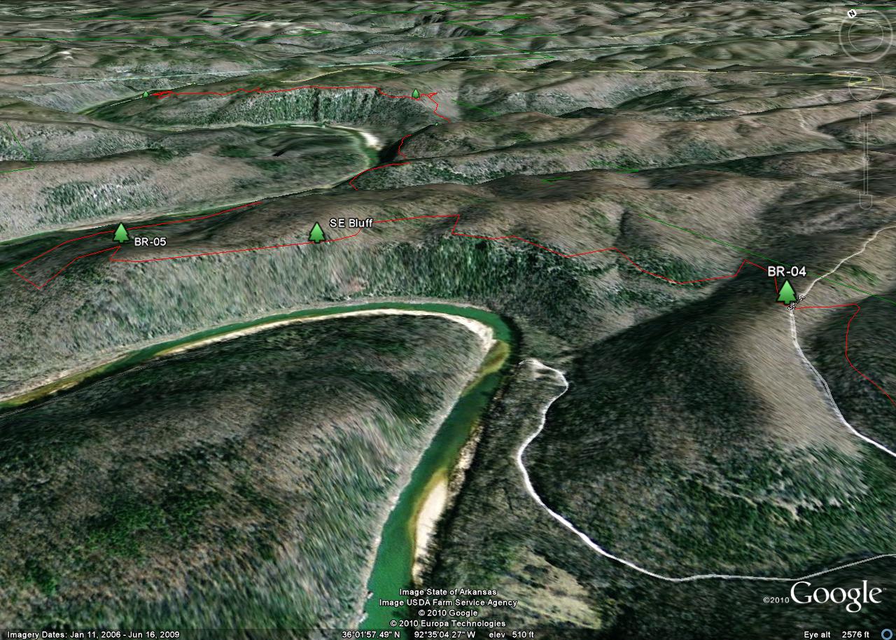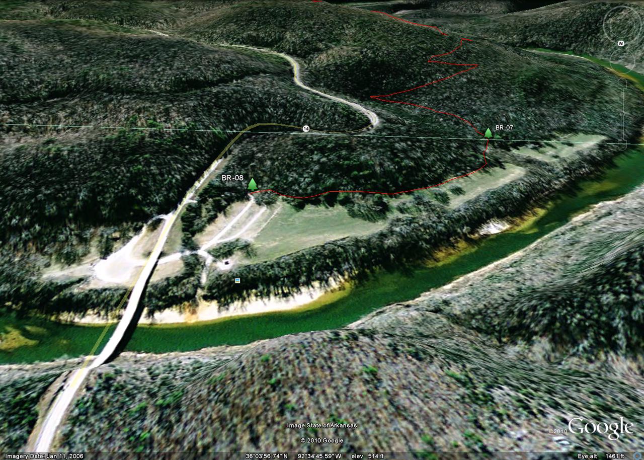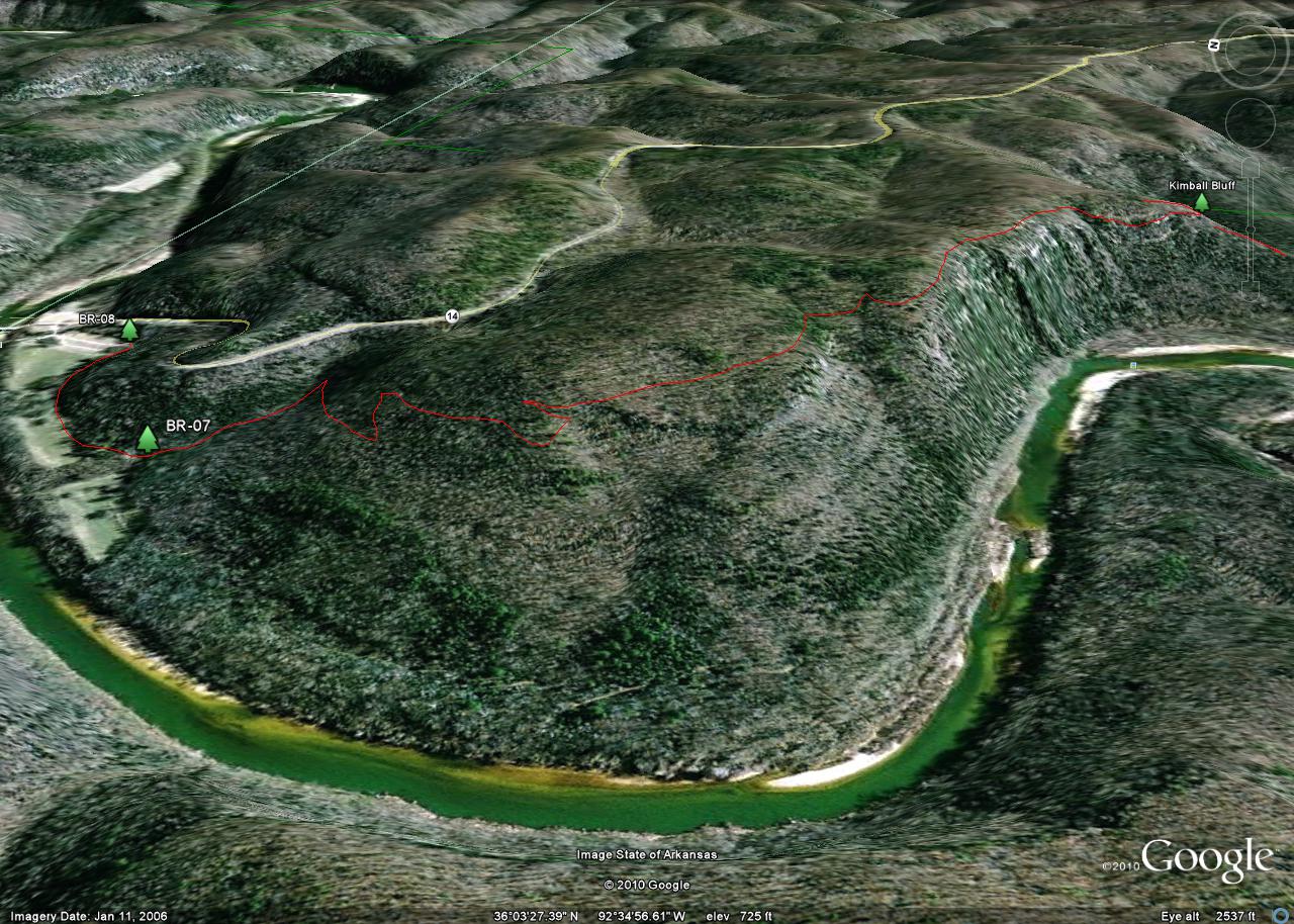 The tracks were taken in 2010 by a team consisting of Ken Smith, Bob Miller (Green Country Outdoor Club) and Rick Davis. The trail is in red and the Buffalo National River is outlined in green. Waypoints are designated with a maroon dot and labeled BR-xx. The mileages shown are between waypoints.