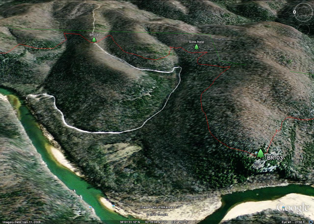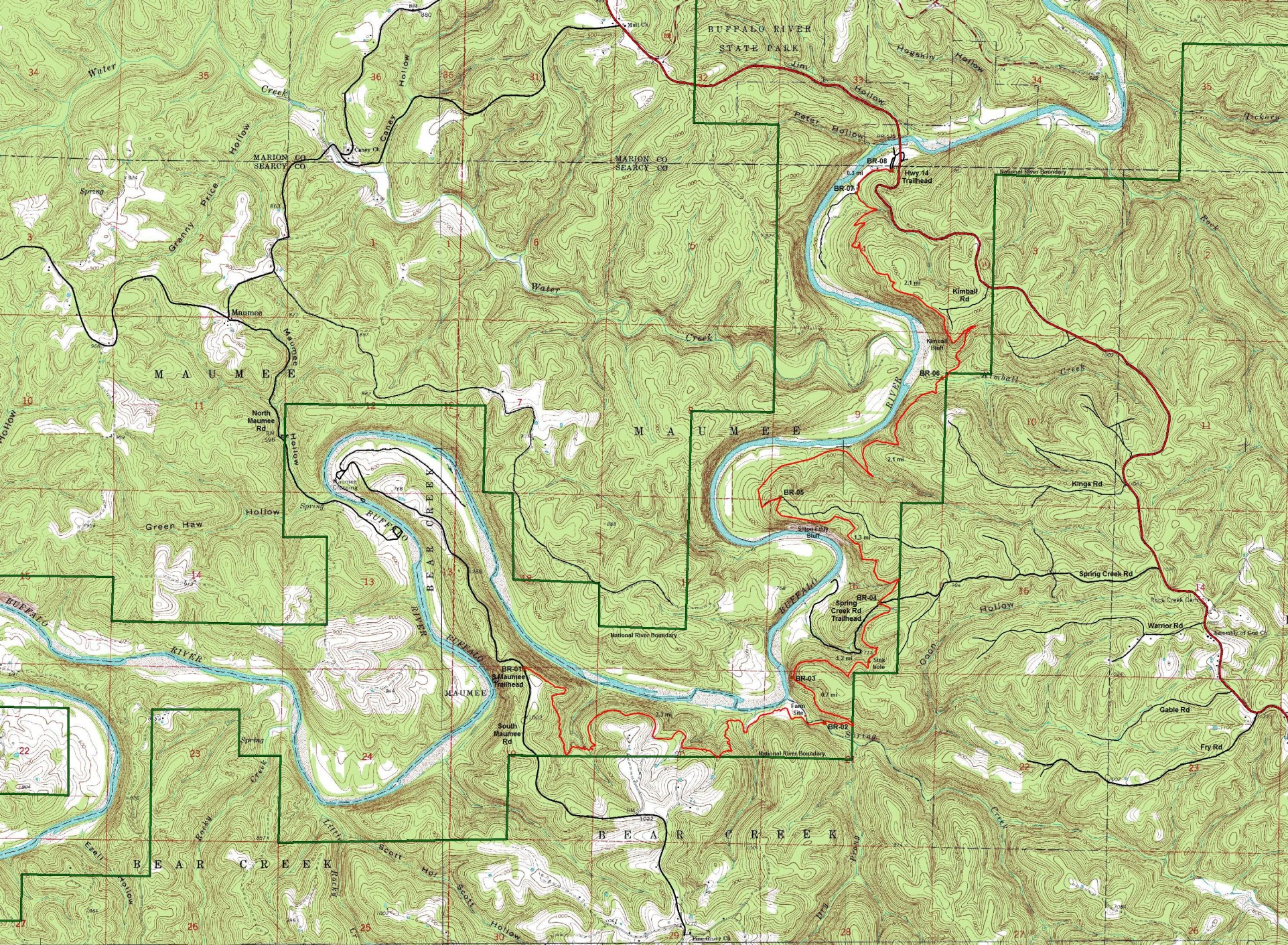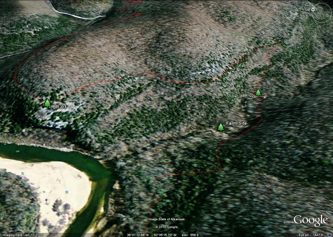 The tracks were taken in 2010 by a team consisting of Ken Smith, Bob Miller (Green Country Outdoor Club) and Rick Davis. The trail is in red and the Buffalo National River is outlined in green. Waypoints are designated with a maroon dot and labeled BR-xx. The mileages shown are between waypoints.