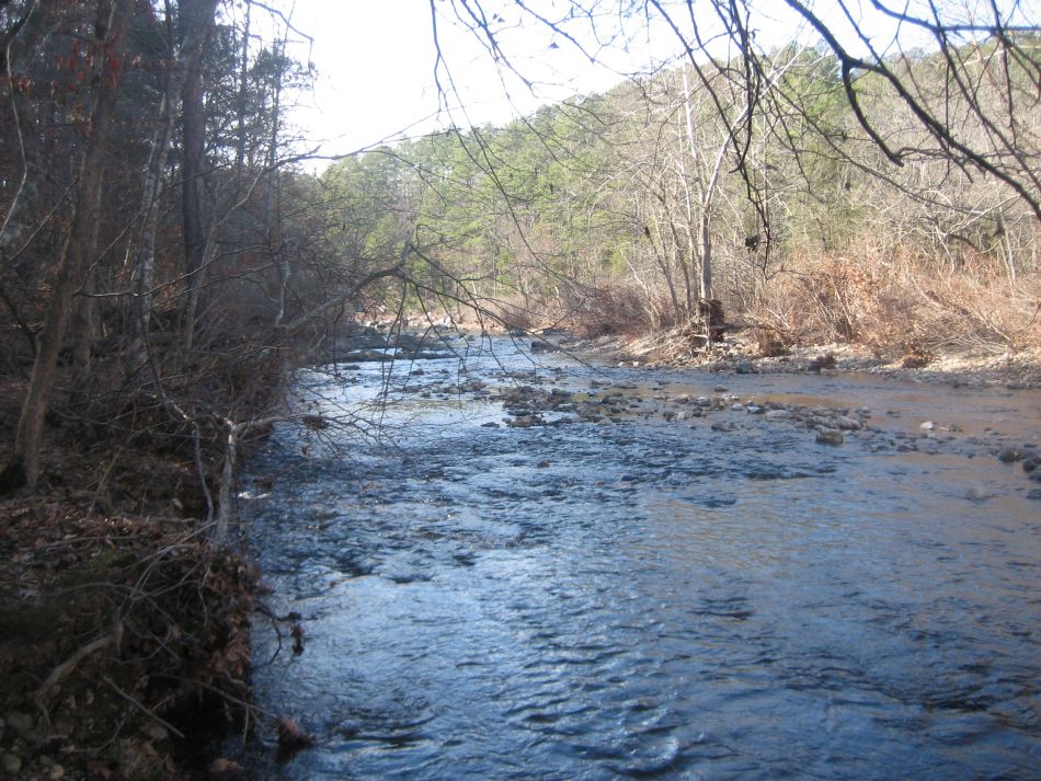 Caney Creek is flowing westward and the trail will head up stream. Check out the clarity of the water; crystal clear because of the novaculite rock. Including the first crossing at 2.2 miles, you will cross it 10 times before the Buckeye intersection. The crossings are at 2.4 miles, 2.5 miles, 2.8 miles, 3.0 miles, 3.3 miles, 3.5 miles, 3.9 miles, 4.1 miles and 5.1 miles...but who's counting. The trail itself is usually easy to follow. It runs along the creek, below bluffs, above the creek on the natural terrace and in bottomlands. The latter, around mile 3.2 is the only place where the trail was a little elusive.