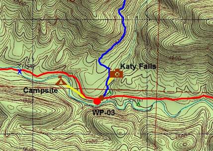 It is one mile and a 500 decent from the ridge to the Katy Falls spur. Most of the hike is a gradual descent along the side of East Hanna Mountain. You will know you are near the bottom when the topography begins to fall away on your right. Soon you will encounter a crude cairn (a pile of rocks) marking the Katy Falls trail spur (mile 5.5). You should definitely check out the falls (video) on your trip. At mile 5.6 is the junction with the Caney Creek Trail. If you are on the loop, turn left (east). If you are heading for the "official" campsite, turn right, go about 0.1 miles and take the spur trail heading down to the left.
