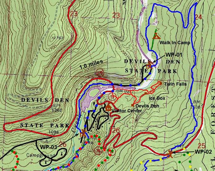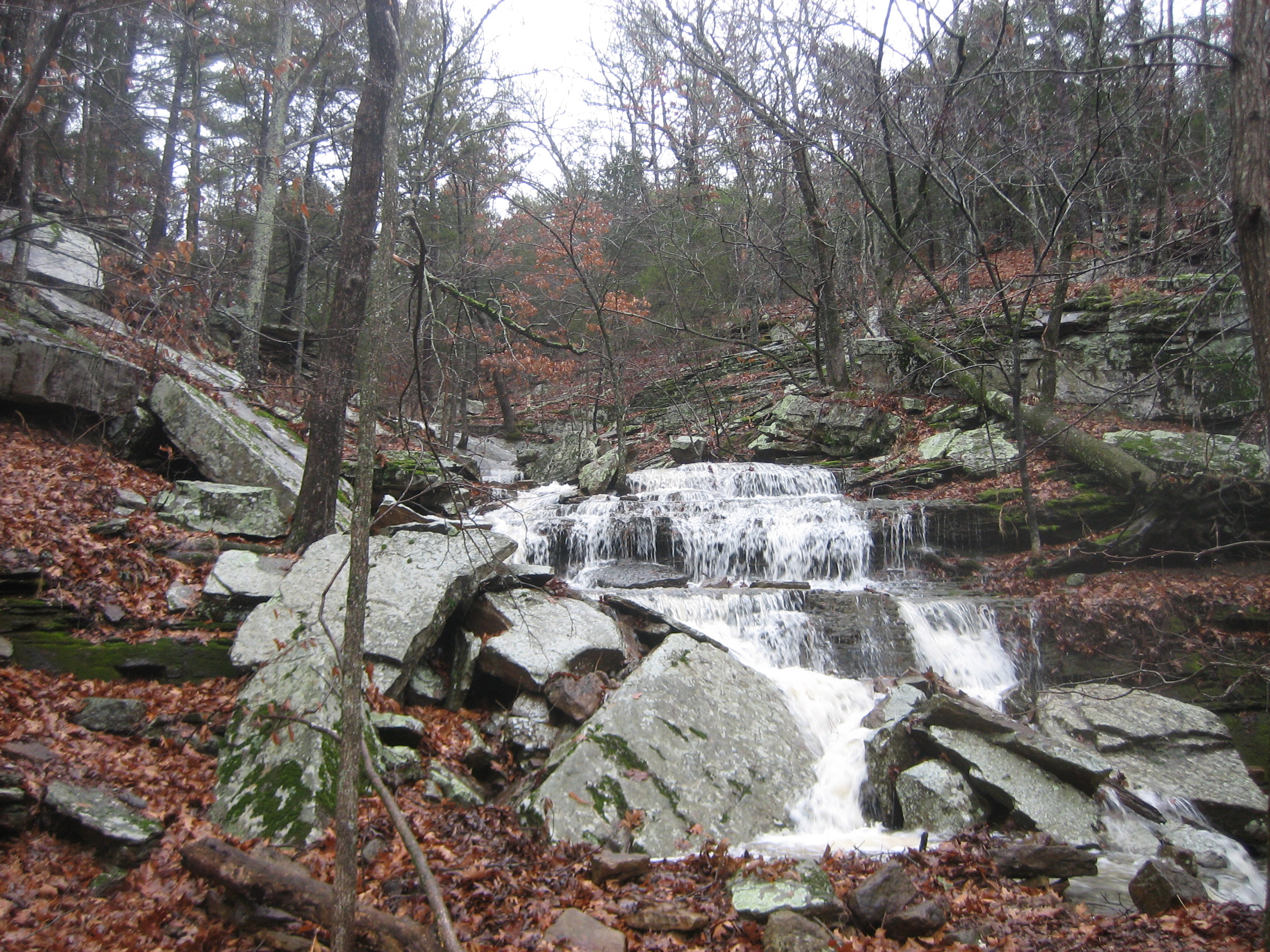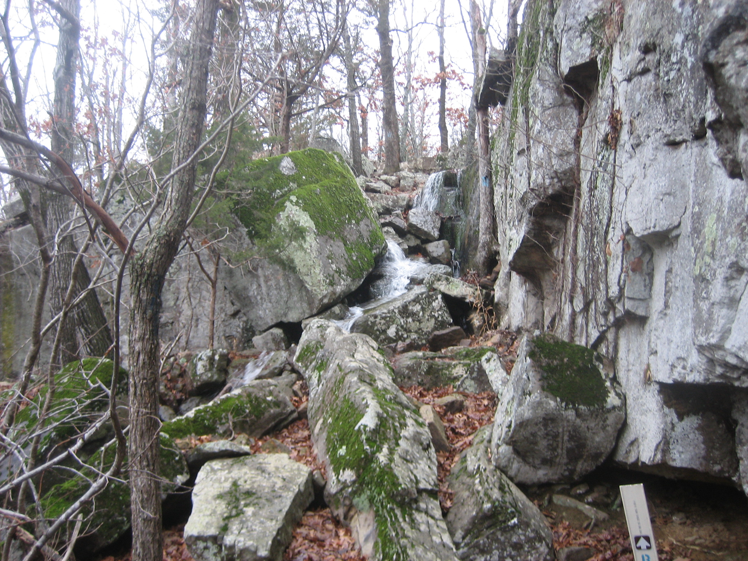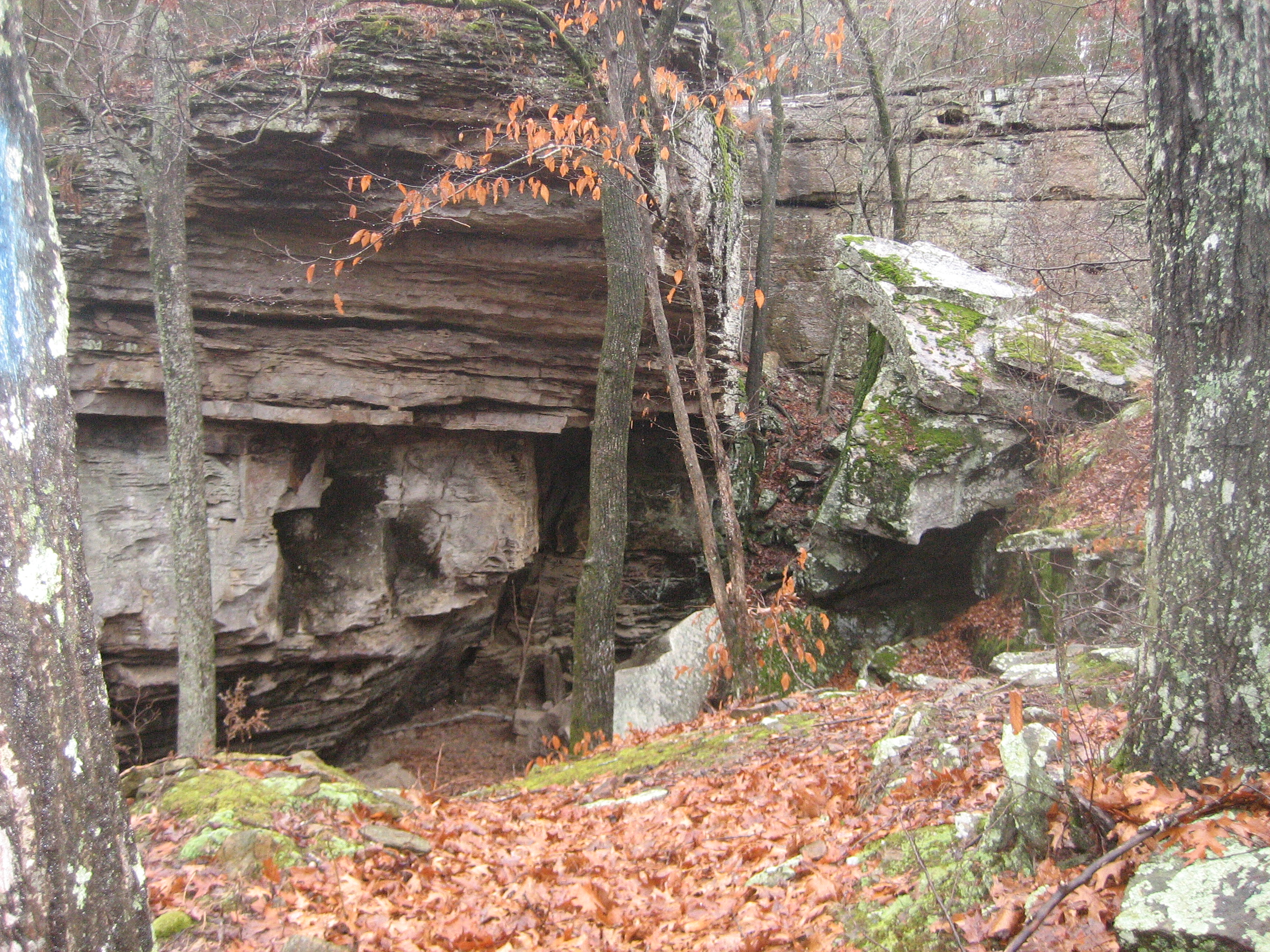 Background: The Butterfield Trail is named for the Butterfield Overland Express stage coach route and offers a rugged overnight hike in the Ozark Plateau. It begins at Devils Den State Park and loops southward into the Ozark National Forest. Devils Den State Park has fee camping and cabins for a late arrival. It features several shorter day hikes including a 1.3 mile loop that visits the name sake fracture cave, the Ice Box (fracture cave) and Twin Falls. It also has many miles of mountain bike trails.