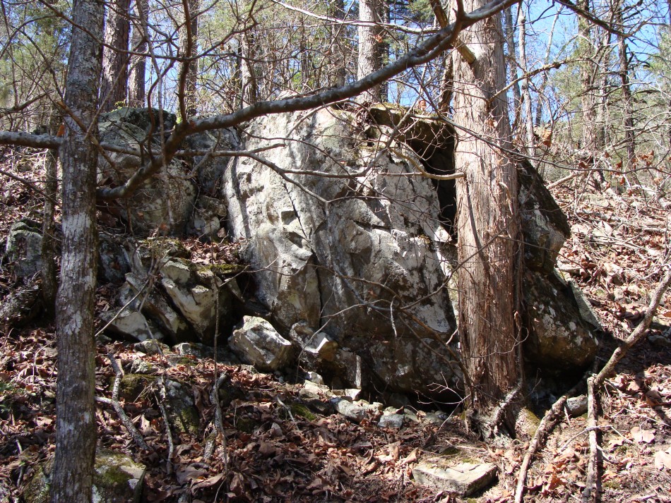 Although the trail stays high above the Cossatot over this next section, the river can be seen below through the trees. The redbuds were prolific all along this first section of the trail from Brushy Creek to Ed Banks bridge. In fact, one area held the largest stand of redbuds that I have ever seen. This stand was on the east side of the river. In addition, wild plum was everywhere and the odor was nothing short of fantastic! There were also many large rocks where thrust faulted blocks of Mississippian sediments of the Stanley Formation are exposed in the forest. One large rock outcrop had a large cedar growing beside it.