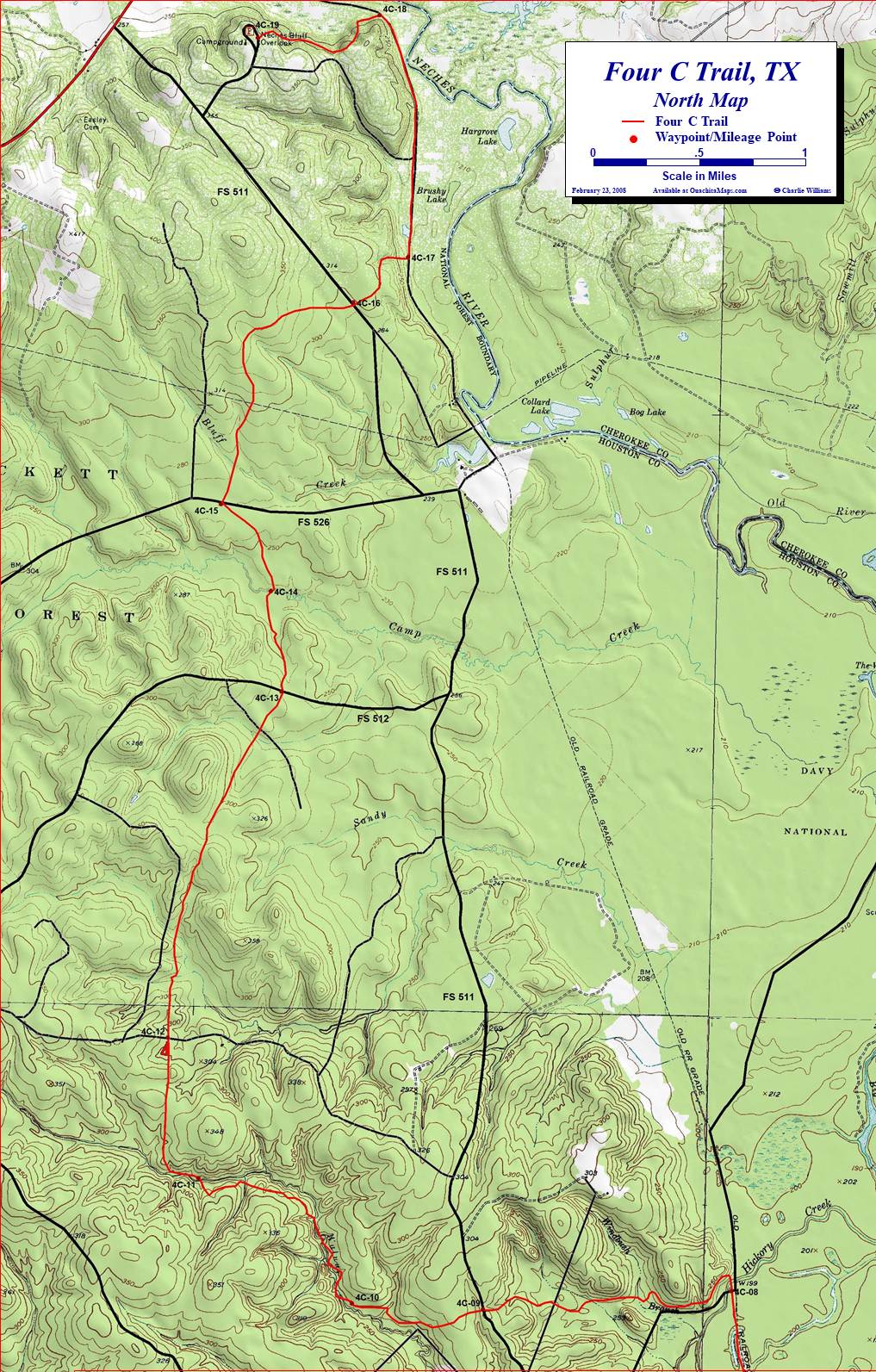 Info: The Four C Trail was featured in Waypoints, Backpacker Magazine, December 2006, Midwest Edition. USGS 7.5 minute quadrangle topographic maps are Ratcliff, Kennard NE, and Weches, TX. Contact the Davy Crockett National Forest in Kennard, Texas at (936) 655-2299.