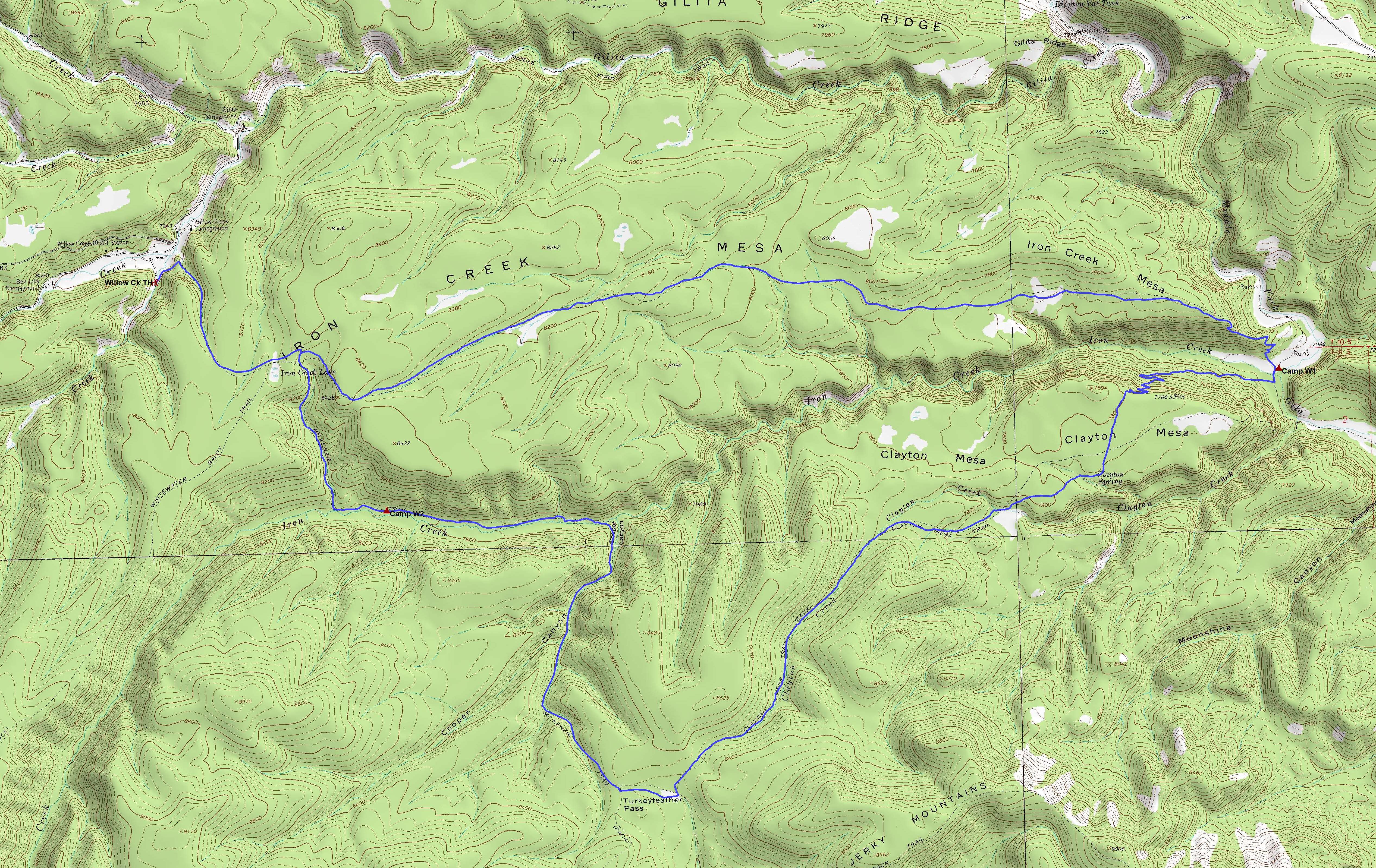 The hike starts at the Willow Creek Trailhead in the Willow Creek Campground. The campground is 17 miles (but over an hour) west of Mogollon NM on Highway 159 (Bursum Rd). See this image. The hike starts with a crossing of Willow Creek and Turkey Creek. After that you are out of the campground and starting a 350 foot climb up McKenzie Trail (#151) to Iron Creek Lake. Turn east at the junction of the Iron Creek Mesa Trail (#171, 1.3 miles) and head across Iron Creek Mesa. The mesa is underlain by mid-Tertiary Datil-Mogollon volcanics ranging from rhyolites to andesites. At 6.8 miles begin your 600 foot decent down to the meadow next to the Middle Fork of the Gila River (7.4 miles).