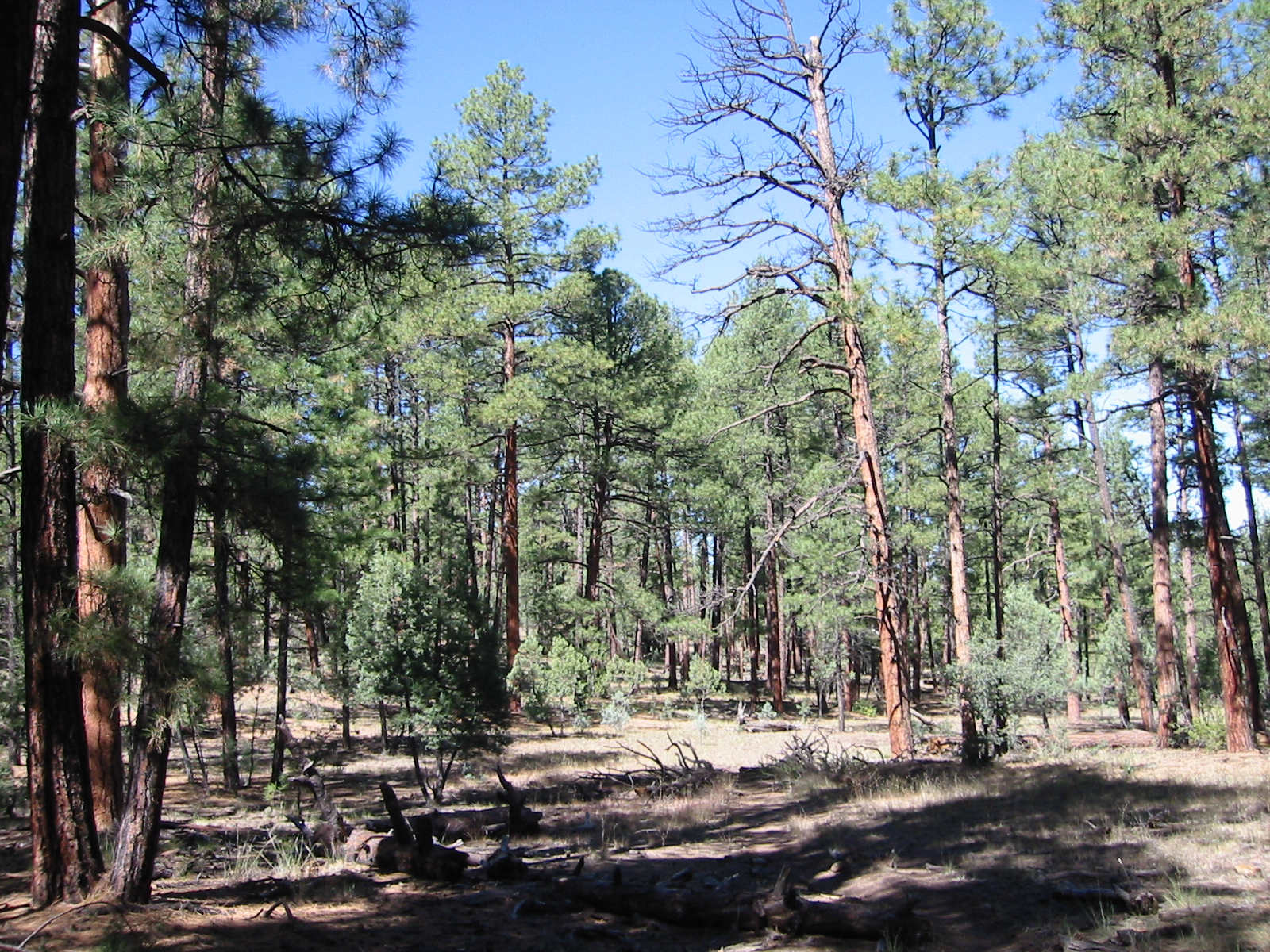 The West Fork Trail continues west but we took the Big Bear Trail #28 to the north. It was a gradual 600 feet over several miles to the top of the mesa Higher on the mesa, the forest is dominiated by ponerosa pines. These statley trees define the 6,000 to 9,000 foot elevation with their platey bark and 4 to 7 inch needles in a fascicle of three.