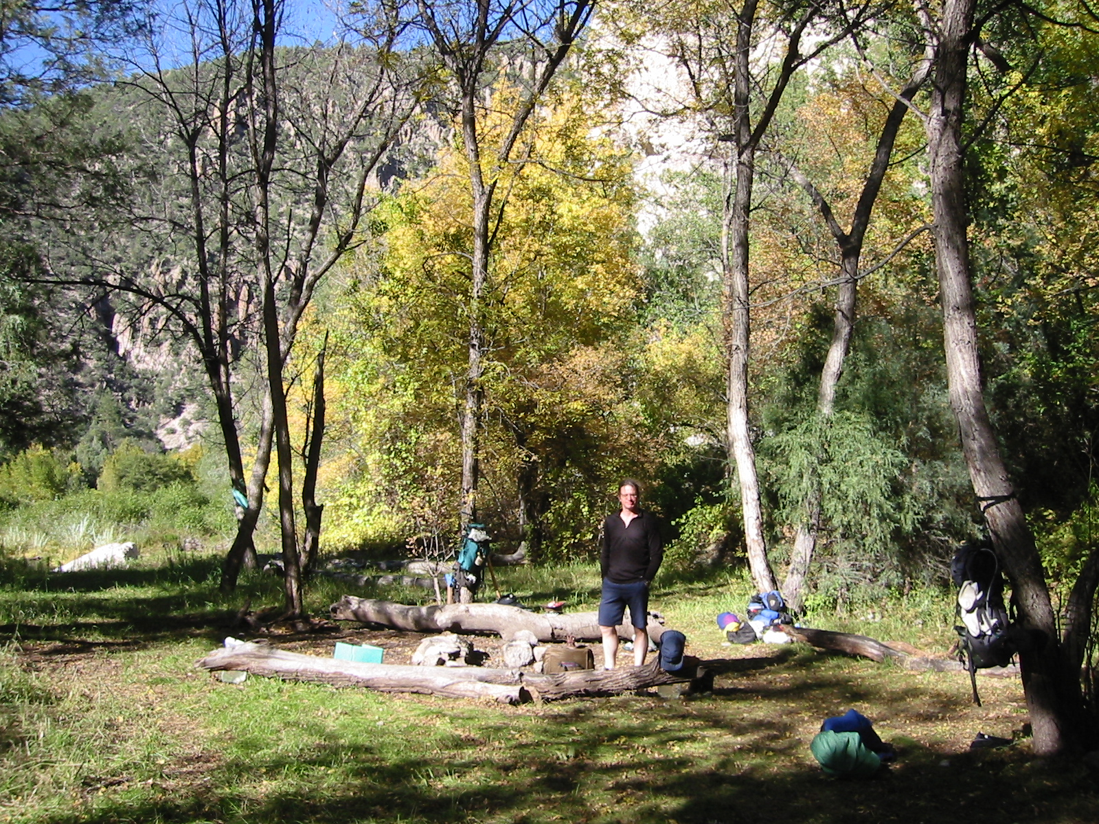 The trail begins at the end of the road, next to the beginning of the loop trail tyo the dwelings. Instead of going south, head west on the West Fork of the Gila River Trail #151. We had a long drive, took the tour and got a late start. As a result, our first camp was only 2.1 miles from the trail head. But what a great site overlooking the West Forkpof the Gila. On the way we saw a wilderness cliff dwelling and some cool spires.
