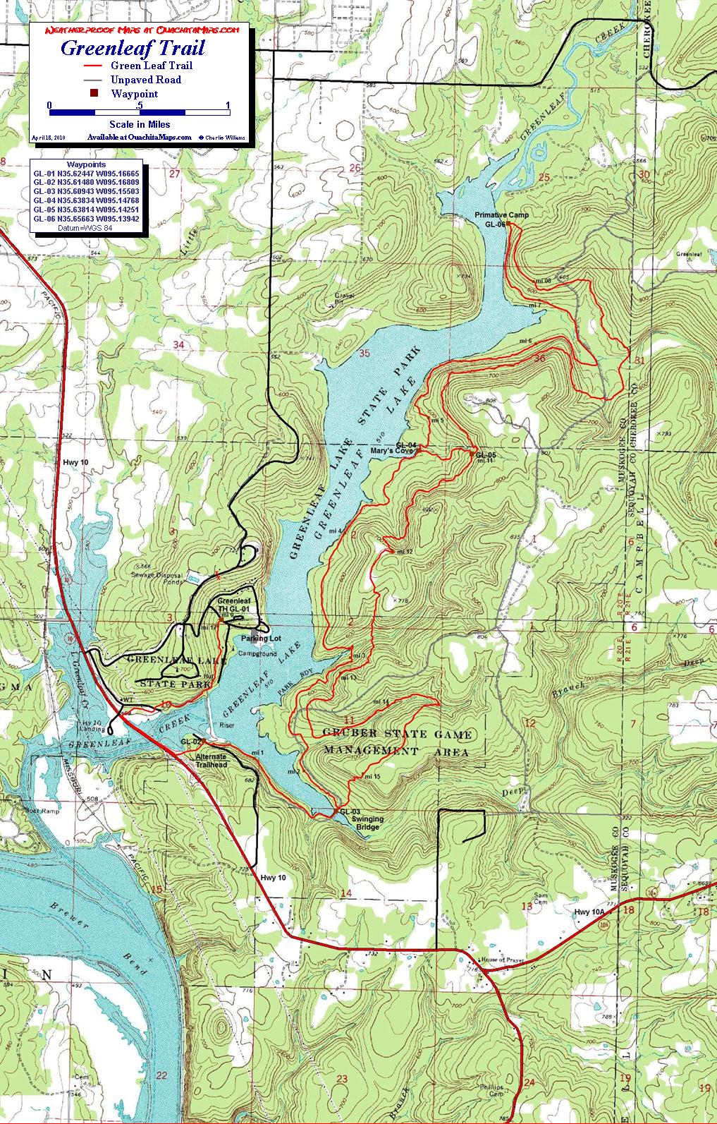 Info: USGS 7.5 minute Quadrangles: Webber Falls and Braggs. Greenleaf State Park, Braggs OK, (918) 487-5196.