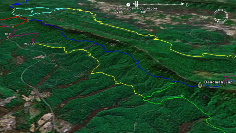 The Map: A free full size version of the map is available on this page as a downloadable jpg. It is also available printed in color on 11x17, "Rite in the Rain” all weather writing paper for $5 plus S&H by emailing Charlie at cew5151@gmail.com. The map is nominal 1:24,000 based on USGS 7.5 minute quadrangle topographic maps.The Loop was mapped with a WAAS enabled GPS and is drawn in different colors to designate each trail. The map shows the OT (blue), Boardstand (green), INT (yellow), other trails (purple) and forest roads not shown on the standard quads (gray). Other features include trailheads, segment mileage, general directions to park, waypoints and waypoint coordinates.