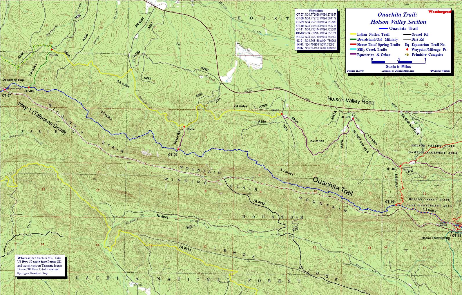 This 21.8 mile loop allows flexible access to the second section of the Ouachita Trail (OT) in Oklahoma by combining it with parts of the Boardstand Trail, Choctaw Nation Trail (formerly Indian Nation Trail, INT), Horse Thief Spring Trail and several other trails. It can be done as 2 shorter loop hikes using a short connector trail.
