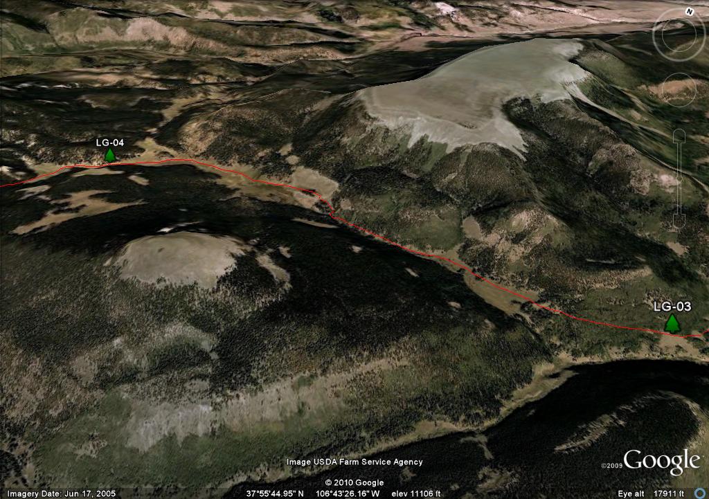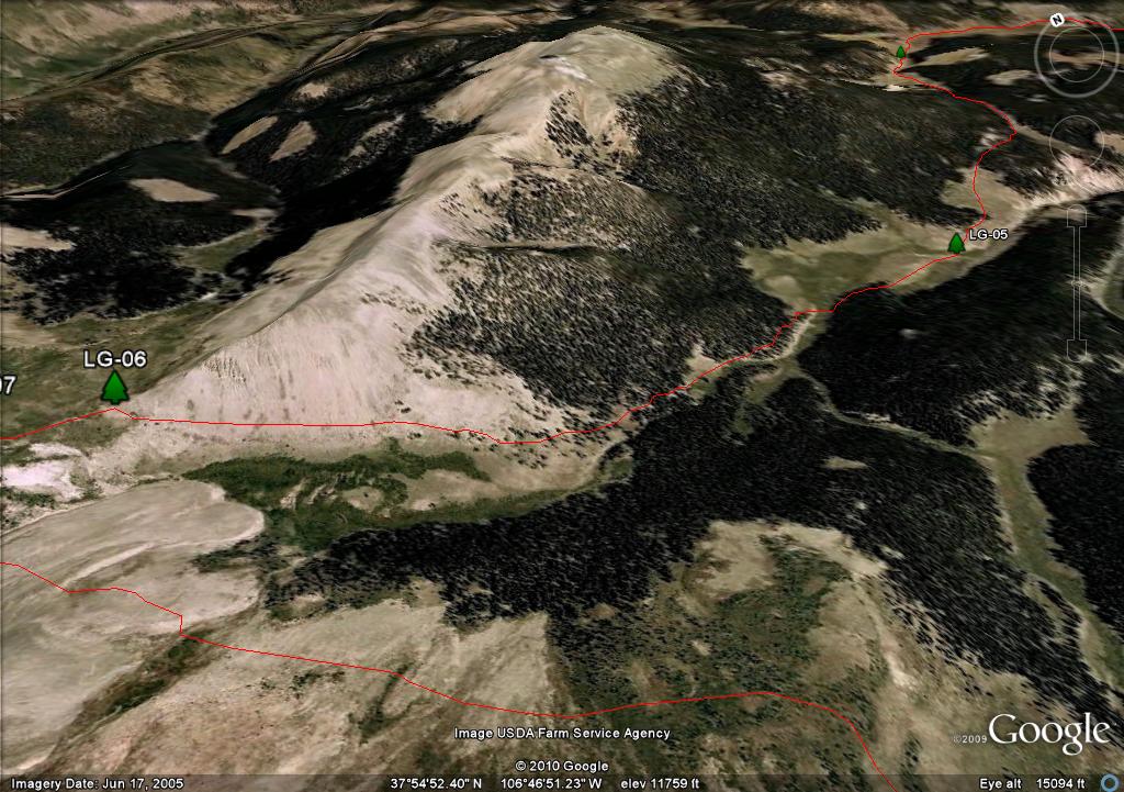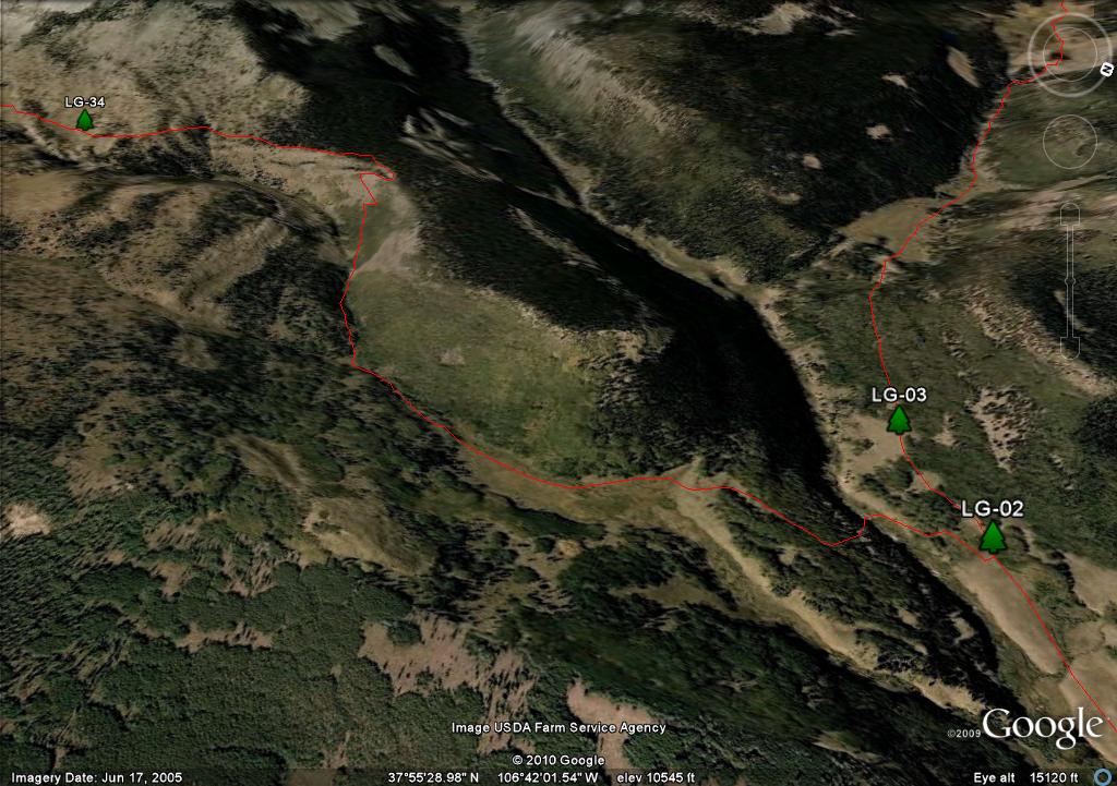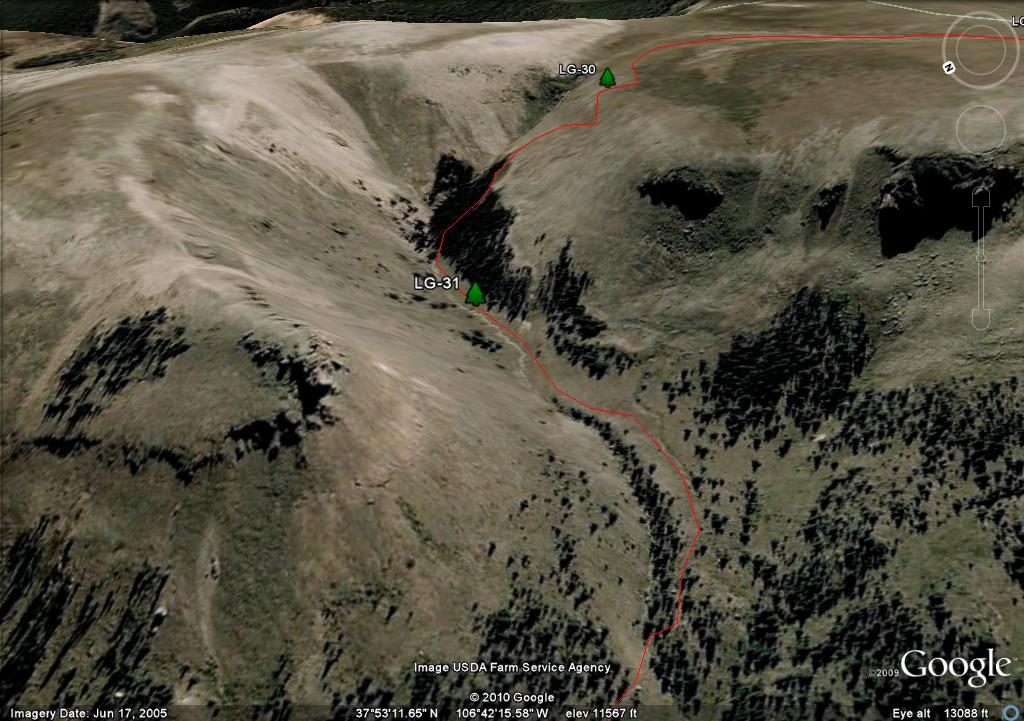 On the map you will see two waypoints on the mesa, LG-25 and LG-26. These are big rock cairn and they are further south than where you need to travel. There are three posts in a triangle, LG-27, LG-28 and LG-29. I show the trail going through LG-27 and LG-29 because it more closely follows the "official" route as defined by both the Forest Service GIS and Trails Illustrated. Since there is no real trail, in retrospect if I had the coordinates of the LG-30, I would have taken a direct route from LG-28 to LG 30.