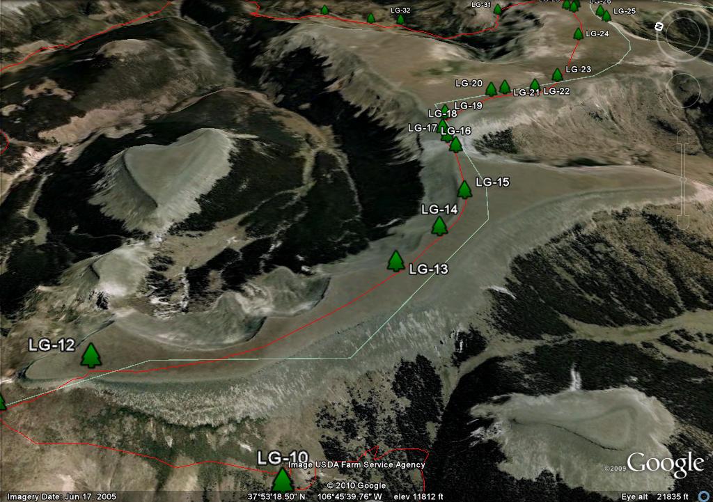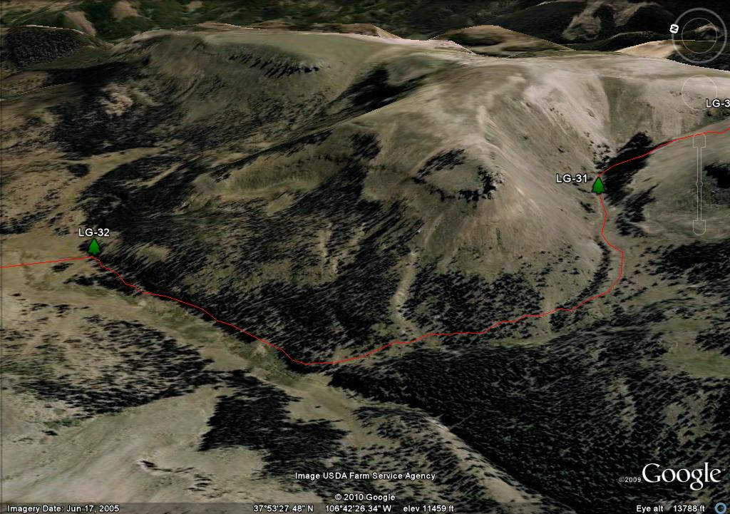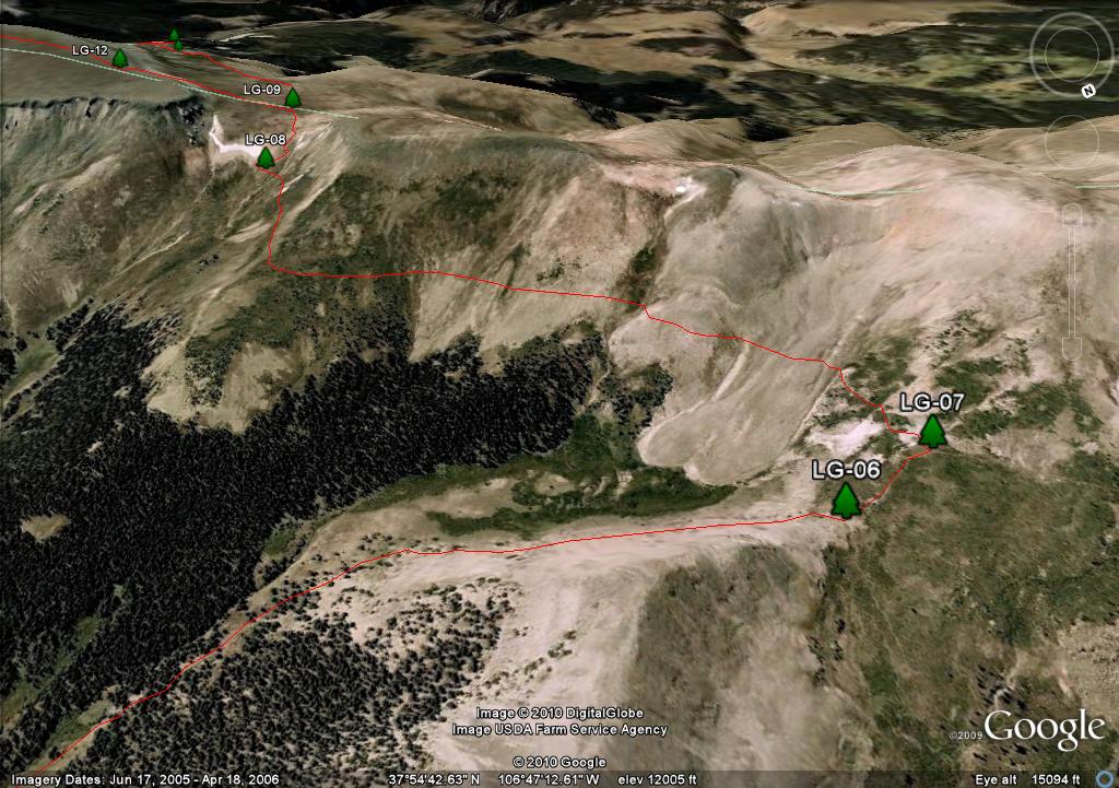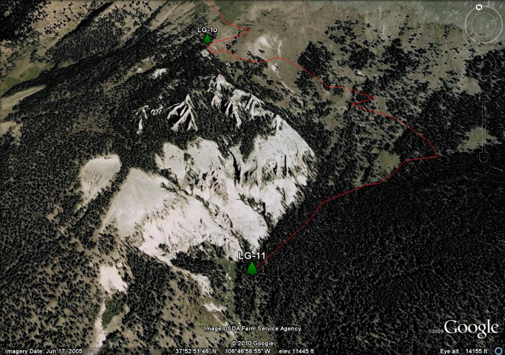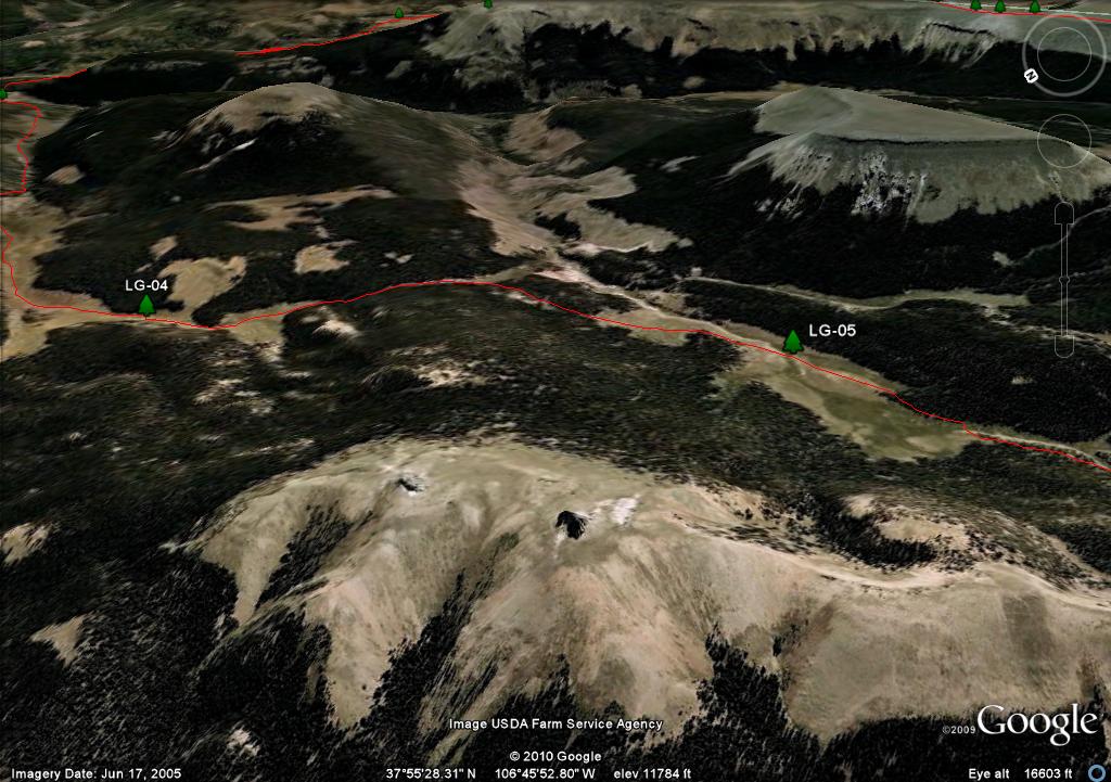 On the map you will see two waypoints on the mesa, LG-25 and LG-26. These are big rock cairn and they are further south than where you need to travel. There are three posts in a triangle, LG-27, LG-28 and LG-29. I show the trail going through LG-27 and LG-29 because it more closely follows the "official" route as defined by both the Forest Service GIS and Trails Illustrated. Since there is no real trail, in retrospect if I had the coordinates of the LG-30, I would have taken a direct route from LG-28 to LG 30.