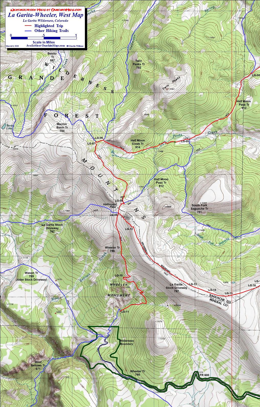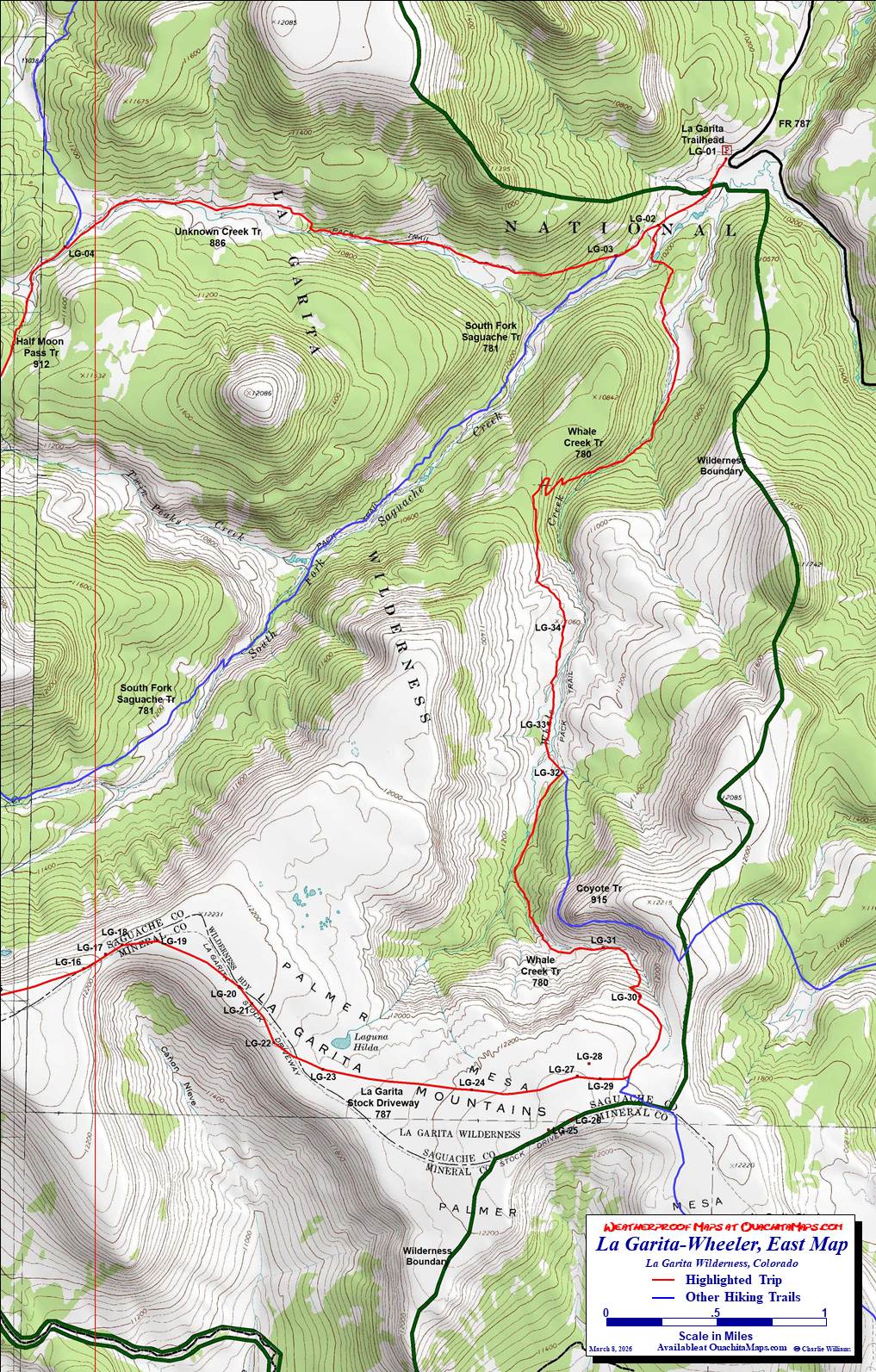 Info: USGS 7.5 minute Quadrangles: Mesa Mountain and Half Moon Pass for the hike and Wagon Wheel Gap and Pool Table Mountain for additional coverage of the southern approach to WGA and the south rim of Palmer Mesa. This entire trip is in the Rio Grande National Forest, headquartered in Monte Vista, CO, telephone: 719-852-5941. The La Garita Wilderness is administered by the Saguache Ranger District, Saguache, CO, telephone: 719-655-2547.
