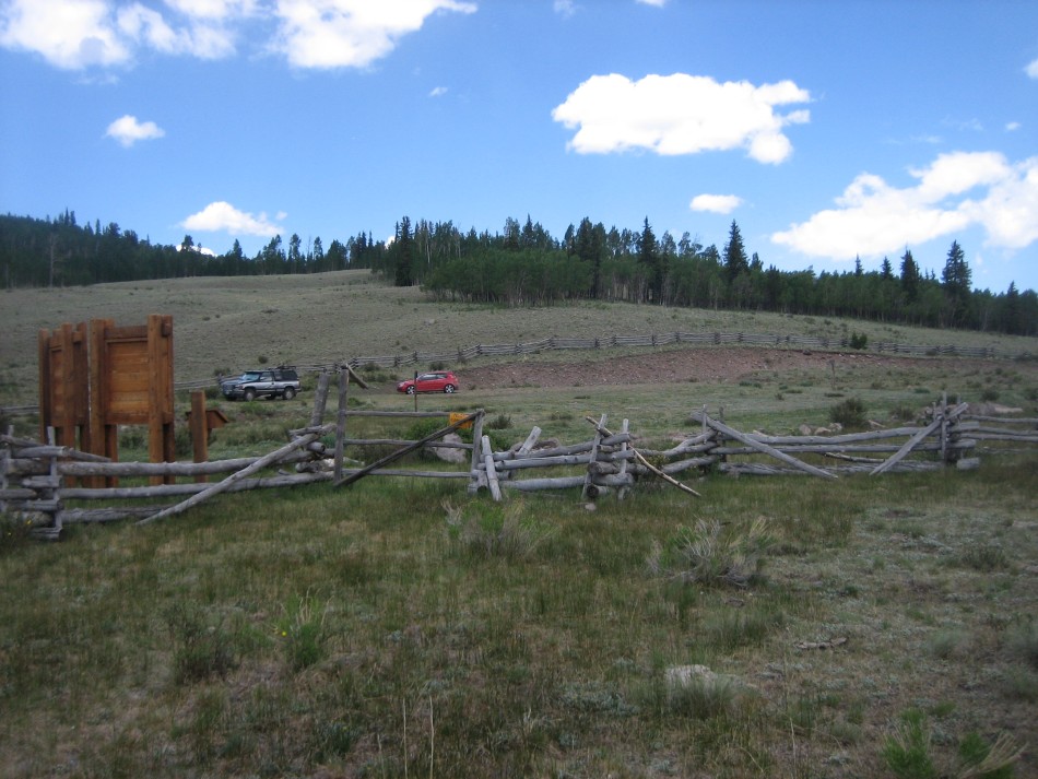 The La Garita Trailhead has a huge parking lot surrounded by a split log fence. There are no facilities. The trail takes off from the south end of the parking lot near the registration sign (LG-01). The trails are not blazed. There are marker posts along the way, mostly at trail intersection, and a few signs, but there are few indications of trail names or numbers.