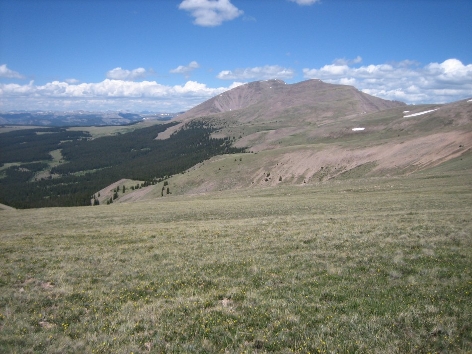 The trail contours above the tree line for about 0.9 miles alternating through grass and shrubs. In front of you juttiing off of a small mesa is a very interesting crag. When you finally turn the corner, you will be in the small basin under Half Moon Pass. When we were there on July 1, 2010, the winter snow field had just melted back from the trail. A note on the trailhead registration board indicated a horse party had to turn back the previous week. The basin is also where we were greeted with a herd of elk working their way up the pass (video). Just before the main climb to the pass, you will pass the junction with the Half Moon Pass Trail (LG-08, mile 7.7). Once at the pass, there are some great views of the side of the ridge you just came from and Wason Park to the west.