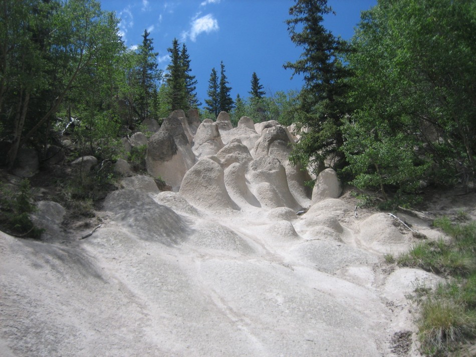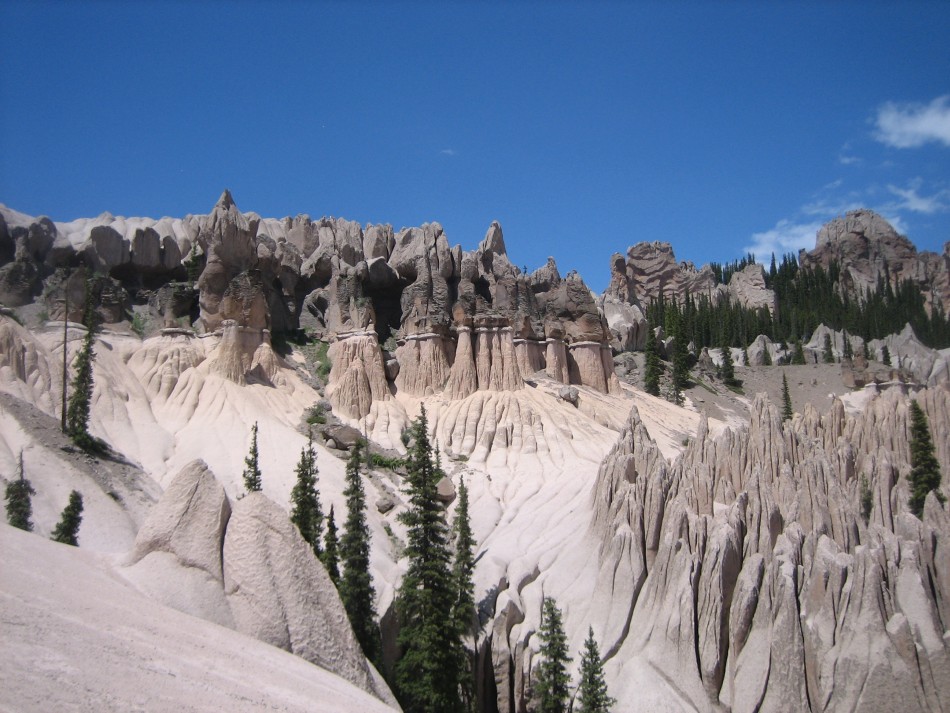 The WGA is awesome (video). Its formation was due first to the layered deposition of volcanic ash. The ash erupting from the San Luis caldera was hot and sticky and the when it landed, the glass shards that make up the fine ash particles fused together to form a solid rock called tuff. Multiple explosive events (think multiple Mt St Helens explosions) resulted in layers of varying thickness. Slightly different chemical compositions, grain size and texture result in different colored rocks. The second step was erosion. Erosion, of course, is a continual process so what we see today is just a snap shot in time. What we are seeing today is that the more resistant cap rock, such as the densely welded tuff that forms the flat topped mesas in the wilderness, has eroded away exposing this softer tuff to erosion. Joints (cracks) in the cap rock allows water to seep down to the tuff which erodes fairly quickly (geologically, speaking) forming hoodoos, columns and pillars.