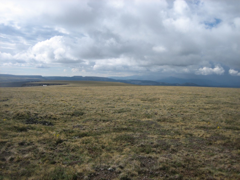 The mesa is different than most mountain hiking I've done. It is flat but at 12,500 it gives you this unfettered, 360 degree view (video). It is all short grass and although certainly not as smooth as a golf course, almost feels like you are walking down a giant's fairway. However, the rough on the side has been replaced by a very rough fall. There is no tread to follow across the mesa and, while you may encounter some short paths, they are short lived. If the sky is clear you can do this section using dead reckoning. Your best bet for the most direct path is to look for the marker posts and walk straight to them. If it is socked in, which could easily happen at 12,500, you'll need a compass or use pre marked waypoints from your GPS.