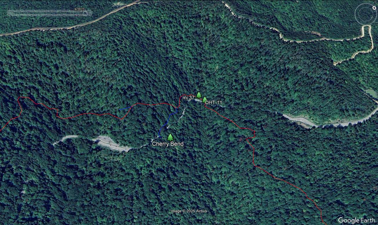 Cherry Bend to Morgan Mt (OHT Map 4): This next section runs from Cherry Bend to the Morgan Mountain trailhead. We had a free weekend and thought we would get a bag night, pick up a new GPS track and update some side trails.The trail starts at the Cherry Bend trailhead on AR Highway 23. Cross the Highway and pick up the spur trail (blue blaze) heading north as it parallels the road. In about 0.1 miles, you will pick up the OHT and continue north. You pass mile marker 37 in another 0.1 miles, just as you pass the bend in the highway, and then cross Highway 23 (OHT-11). Vehicles from the left are on a steady downhill run and the vehicles from the right are coming around a sharp curve. Look both ways and cross with caution.