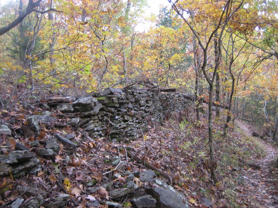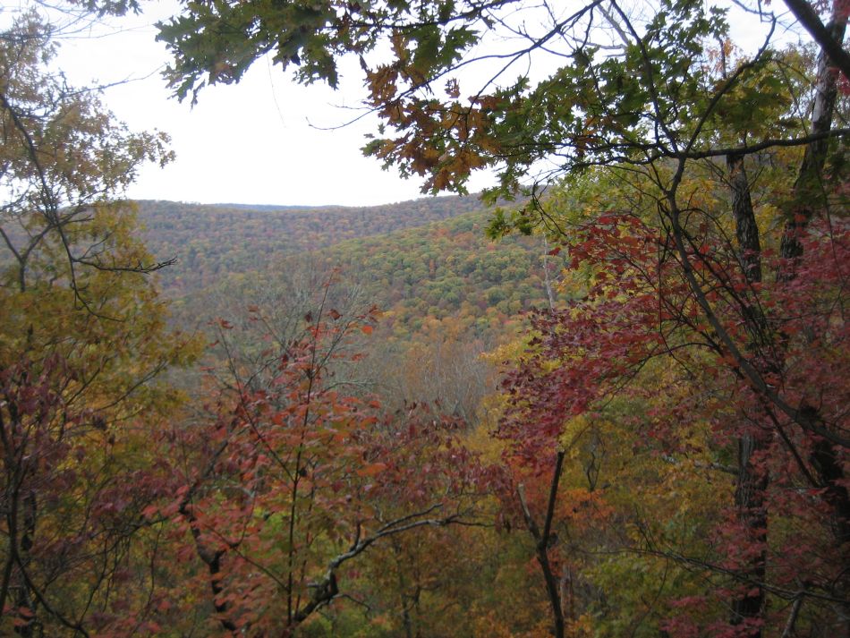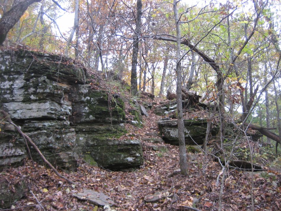 The first 3 miles of this section are a pretty level walk through the woods. The trail is well marked and the path easy to follow. At mile 38.1, you will cross a forest road. Since this trip was in the fall, leaf cover kept any views to a minimum. I remember, however, from several winters ago, climbing up to the base of a bluff (mile 38.7) and taking a lunch break. I recall it a pleasant spot, but no trace of it this weekend.