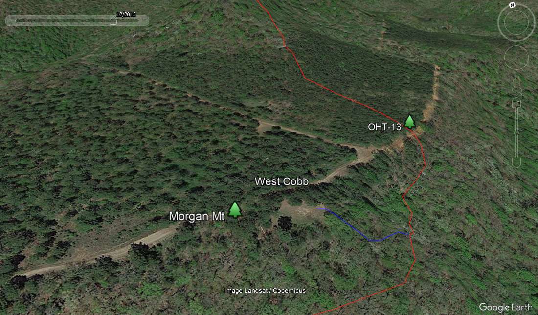 The trailhead spur is marked in blue and there is a sign on the right side of the OHT at the junction. OHT- 13 is another 0.1 miles, where the trail crosses FR-1504. The official Forest Service name of the trailhead is Morgan Fields, but no one uses it. The topo calls it West Cobb and that brings nothing but questioned looks. Tim Ernst calls it the Hare Mt trailhead. The guys at Turner Bend call it Morgan Mt and since they are my ride, I do too.