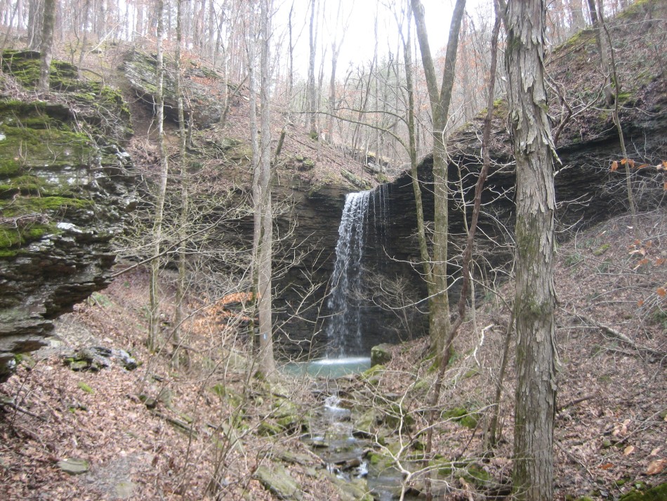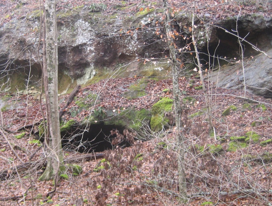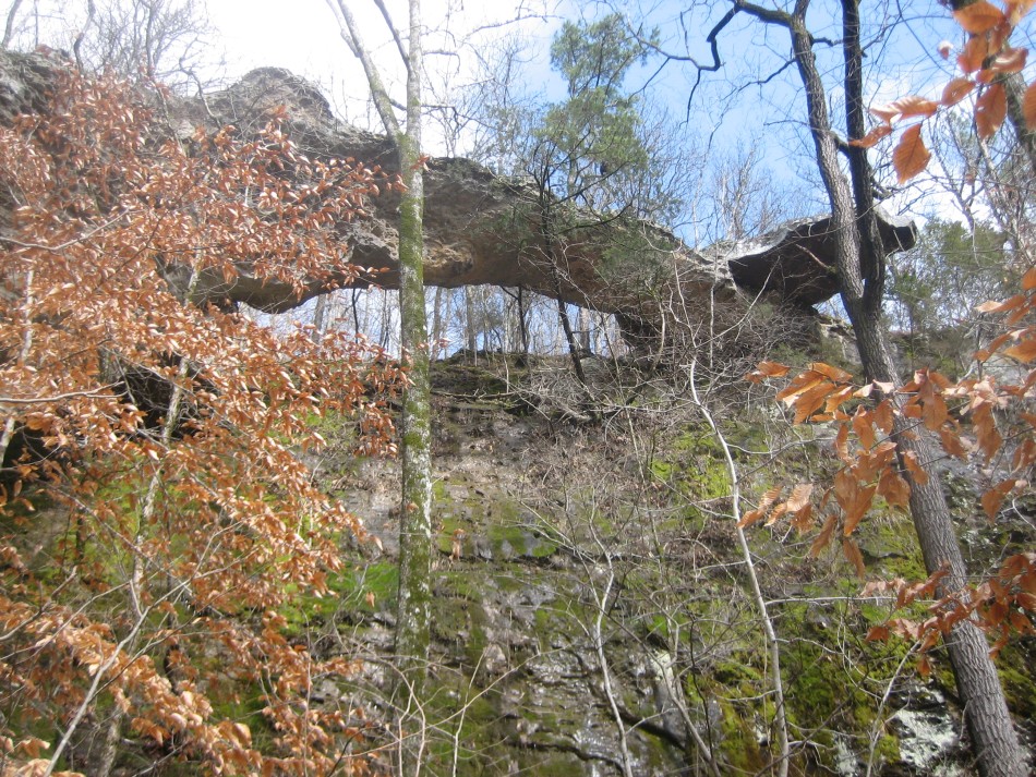 Mile Marker 114 to Haw Falls (OHT Map 11): Leaving the valley, the trail stays low and near the creek for the next 1.8 miles. At Mile 13.2 there is a big campsite. At Mile 13.4, the trail crosses a little creek, climbs past some scenic boulders and intersects the short spur trail to the Natural Bridge (video). The bridge and adjacent bluffs are made of the Prairie Grove sandstone of the Hale Formation. There are overhangs in the bluffs that can offer protection from rain. Tim Ernst mentions this in his trail guide and then cautions about camping there due to bear activity. Ah, the elusive Arkansas black bear.
