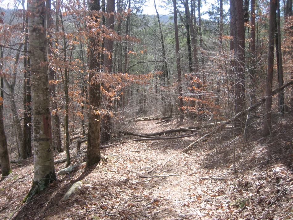 At 2,170, Fairview is the high point of the trip so the trail starts with a descent. At about Mile 0.5 you come in to an area of pines, at Mile 0.8 there is a forest road and right after MM 124, the pines will slacken off. The 950 foot descent ends at a small tributary of Buck Branch, which can be seen on your right. A little ways after the creek is you pass MM 123 and then intersect Forest Road (FR) 1209 (WP-38, Mile 2.0). Follow FR 1209 about 0.1 miles and just past the second small creek crossing (there are culverts under the road), take a left and follow the trail south as it begins a 350 foot climb.