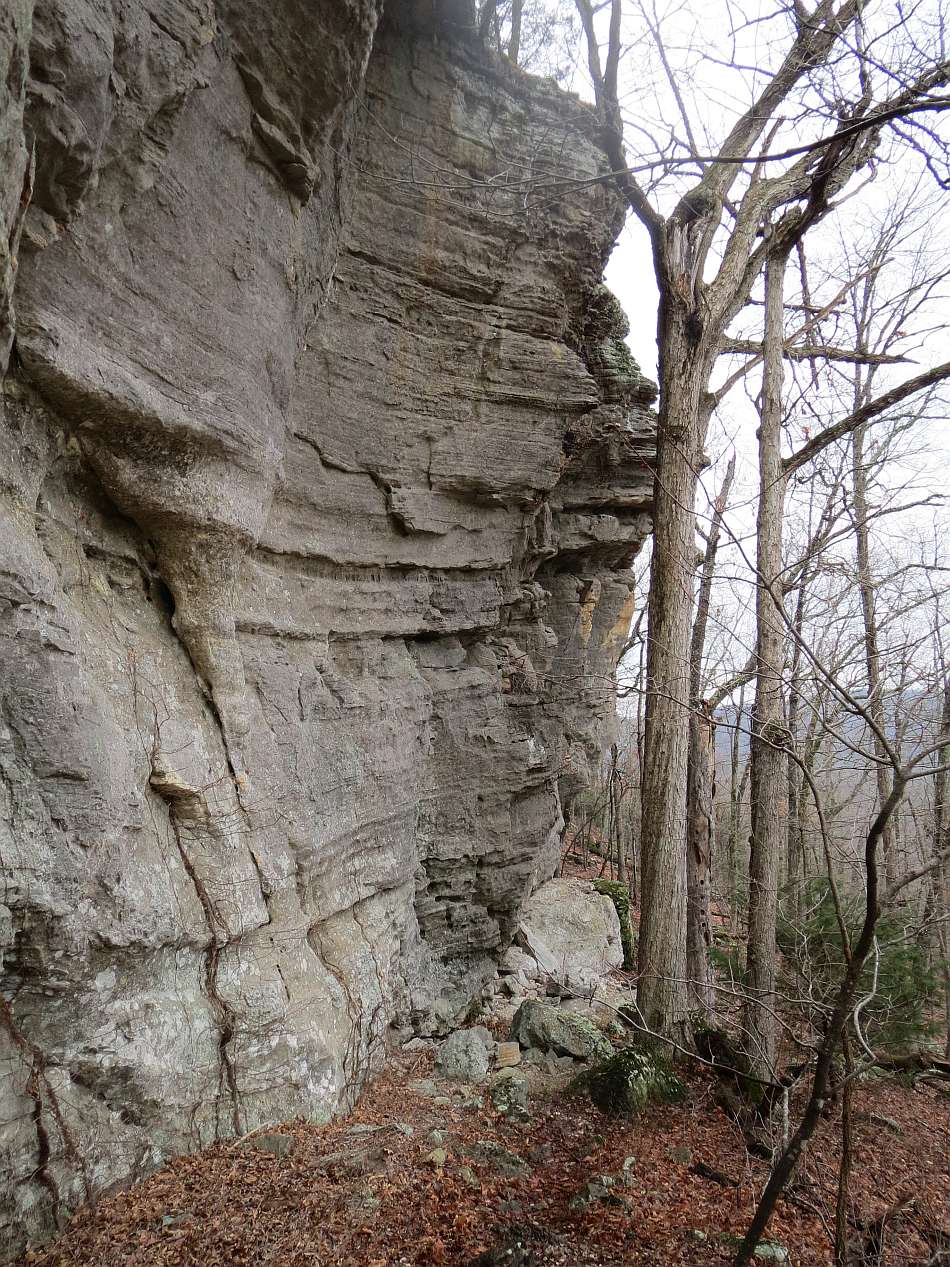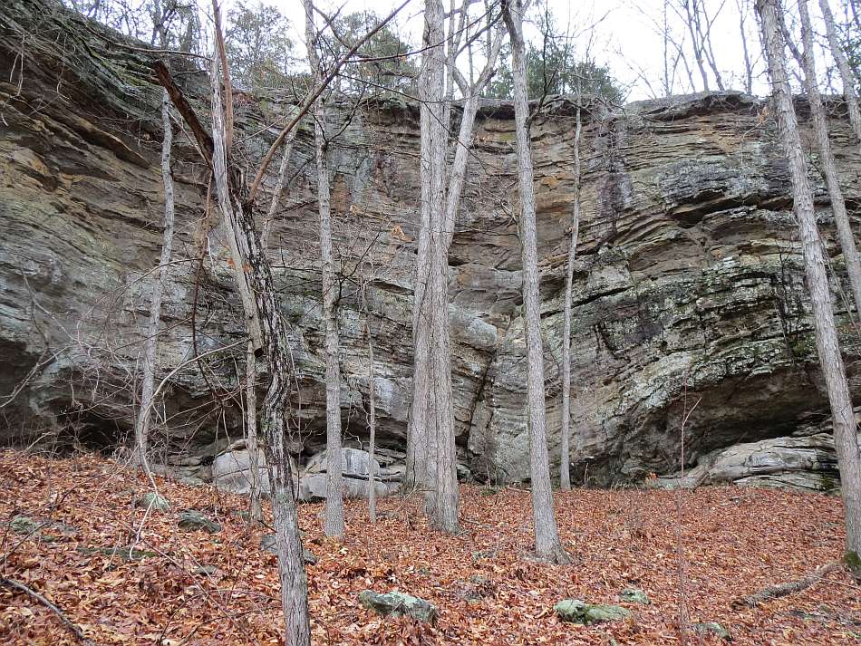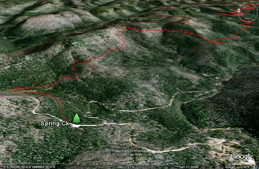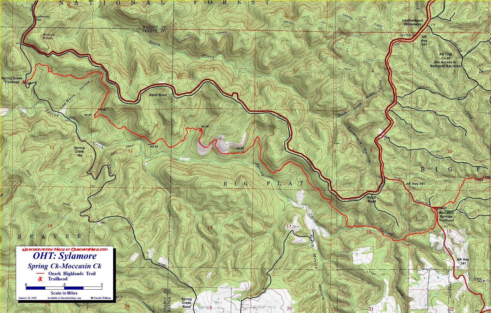 The trail begins at the Spring Creek Trailhead on the very west side of the Spring Ck-Moccason Ck map. It is accessed by the Spring Creek Road from Big Flat and Highway 14. The trail follows the base of the escarpment north of Spring Creek to AR Highway 341. Across the highway is the Moccasin Springs Trailhead.
