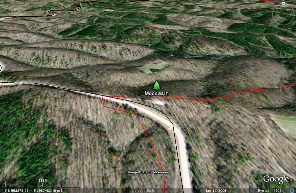 Access to the trail is by Highway 341. Taking it north crosses the White Rive bridge to Norfork AR. Taking it south it winds around the area of the trail, passing the trailheads mentioned above. At the very very SE corner of the Spring Ck-Moccasin Ck map, 341 can be seen (un-labeled) as short red east-west line where 341 is leaving the map.