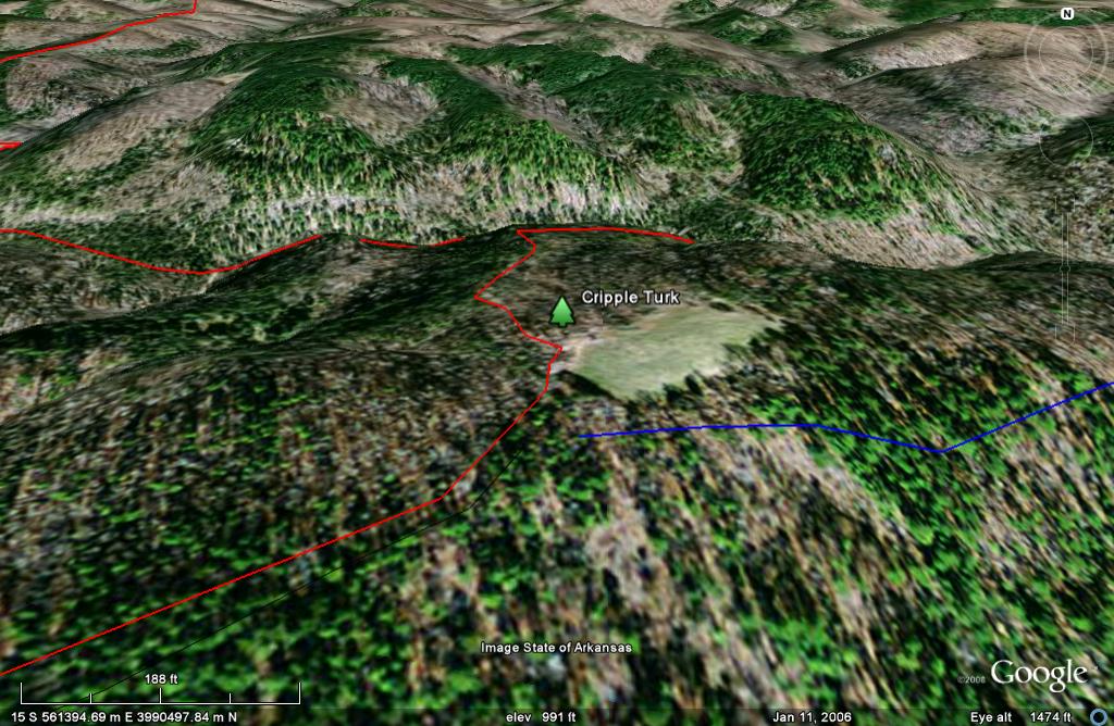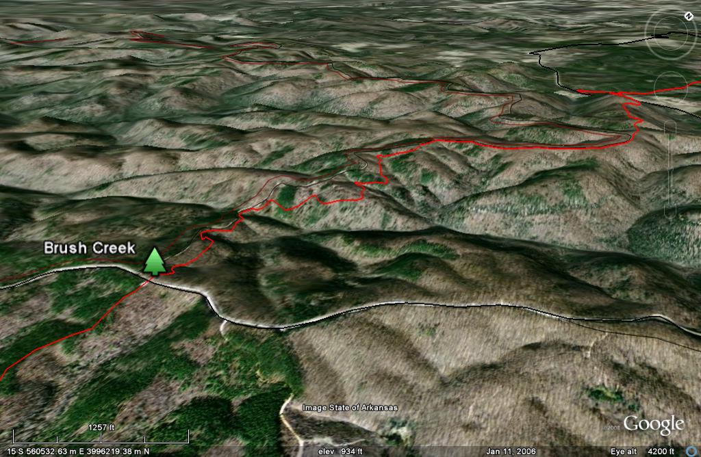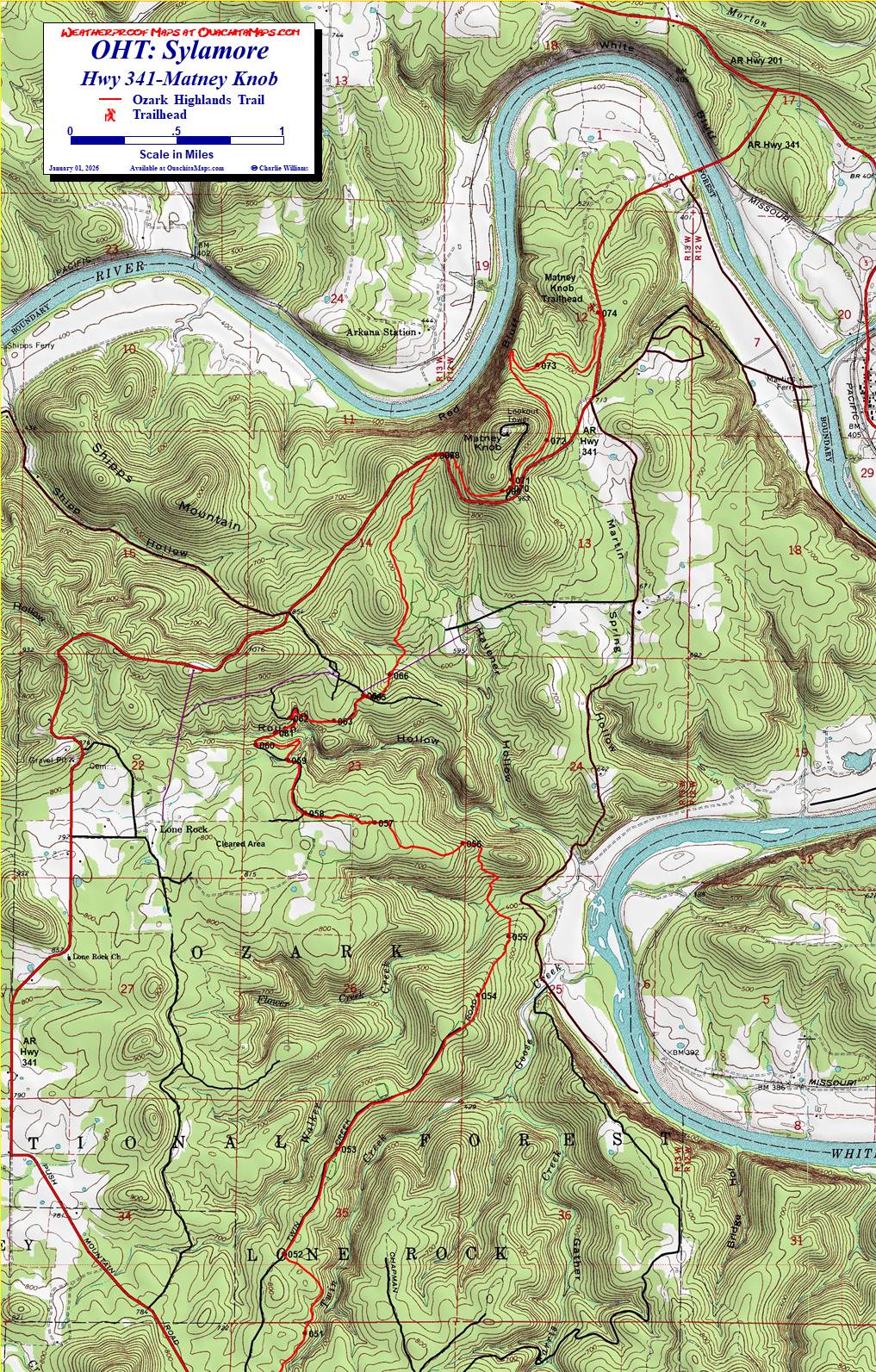 The OHT Sylamore Section is situated in the Ozark Mountains of Arkansas near the confluence of the Bufflo and White Rivers. The OHT trail is based on my GPS track of the trail. The roads are based on satellite images.