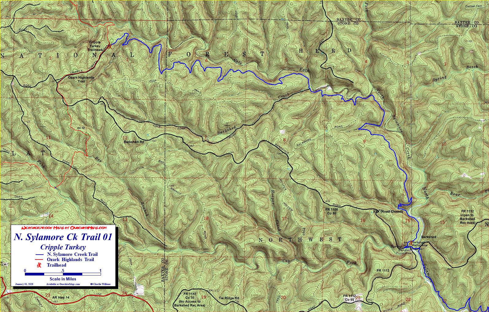 About a mile past the trailhead, the trail enters the Cripple Turkey Map at the middle of the west edge. In another mile it leaves Cap Creek and heads north to the Barkshed Road. The trail follows the Barkshed Road for 1/3 of a mile and then veers north east following the Cripple Creek Road. In another mile is the Cripple Turkey Trailhead. This is also the begining of the North Sylamore Creek Trail, shown in blue. It beautiful with its crysal clear water and massive sandstone bluffs. The OHT continues NW from the trailhead, crosses the Baxter-Stone County line and leaves the Cripple Creek Map.