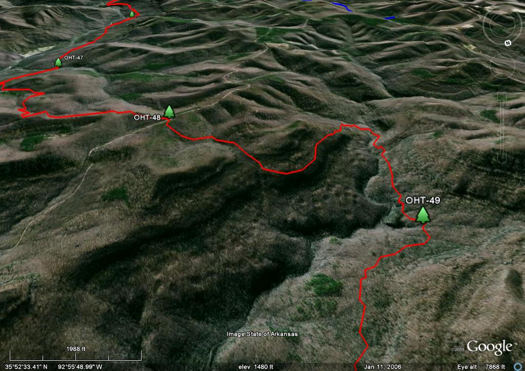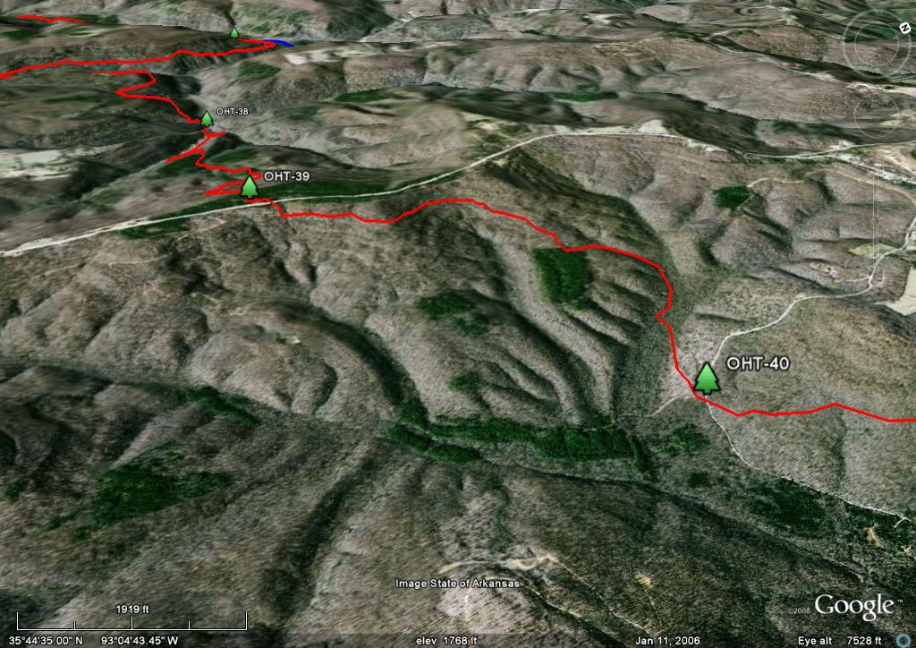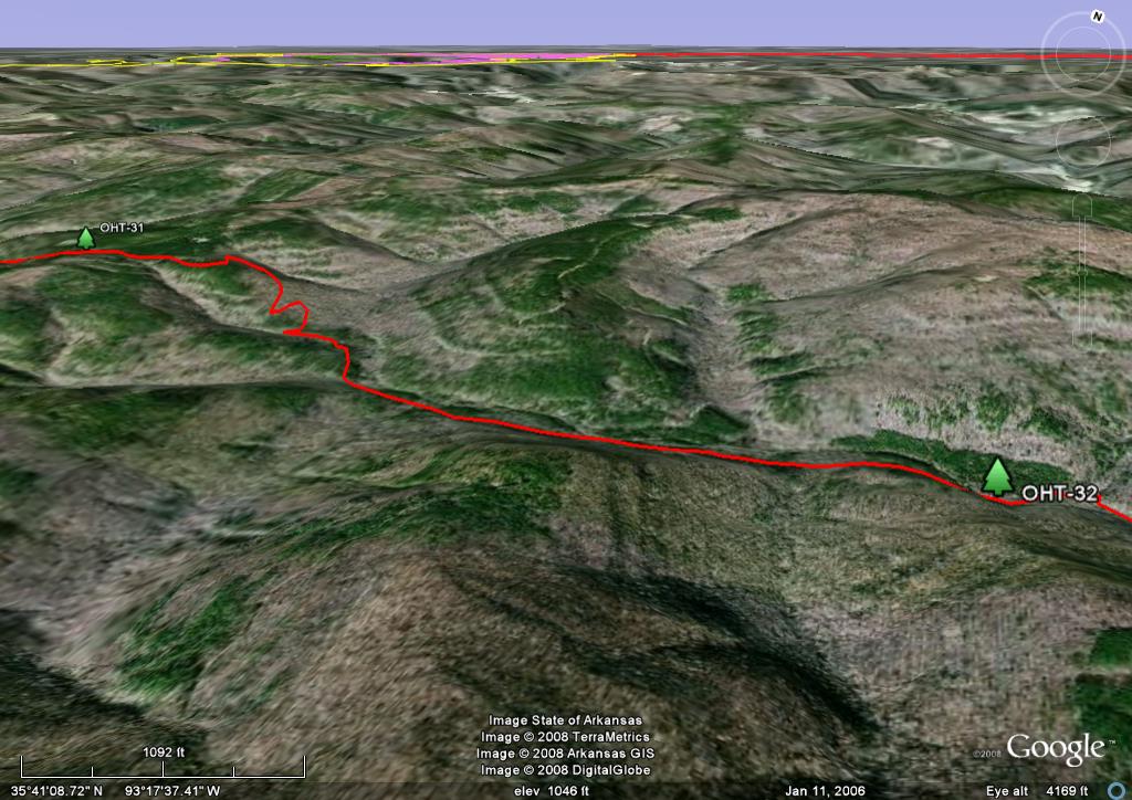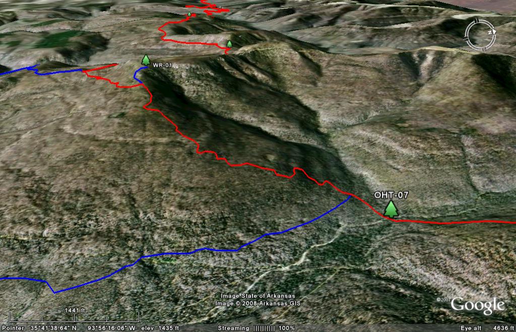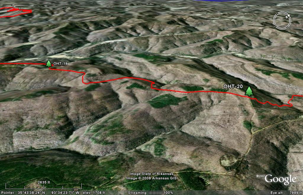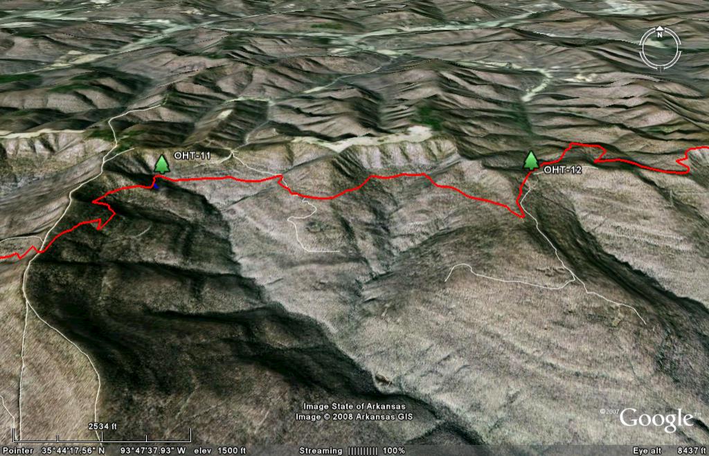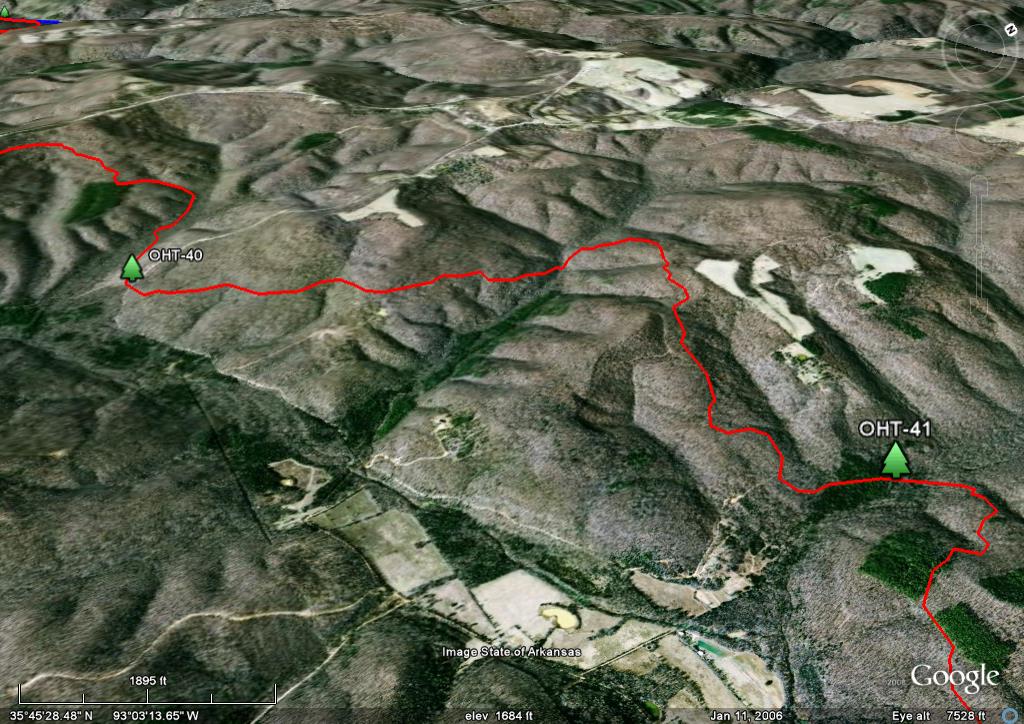 The maps have been updated since I first posted them in January 2008. I have re-GPSed the trail from Lake Fort Smith to Woolum and added the trail description pages. I was foiled by highwater so the 1.4 mile section between Ben Hur and the Richland Creek crossing is based Eric Strong’s 2004 GPS track and Google Earth. Because of the scale of these maps and GPS data, they are the most accurate maps available for the trail. I hope you find these useful for your next trip to the Ozarks.