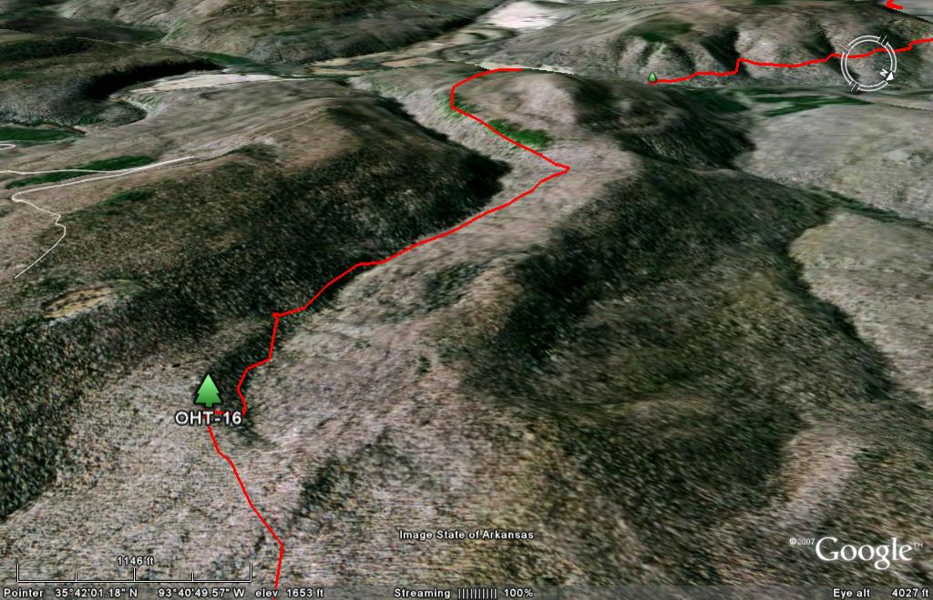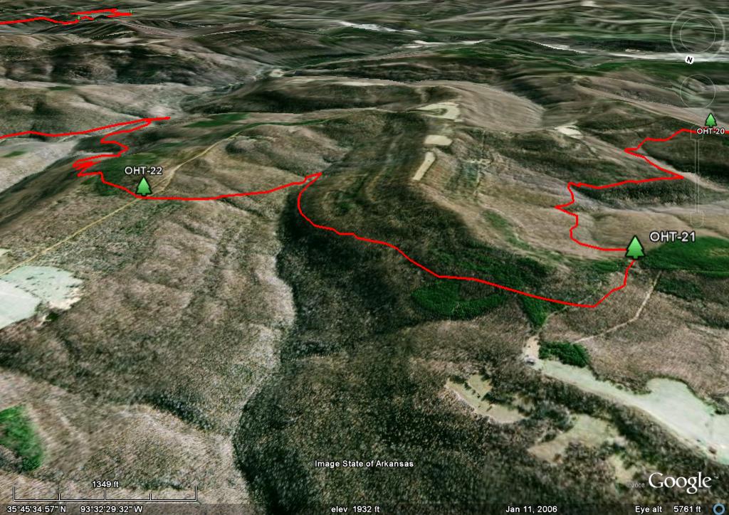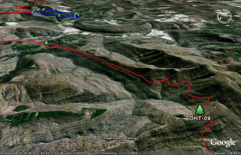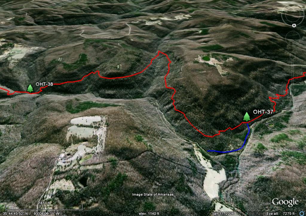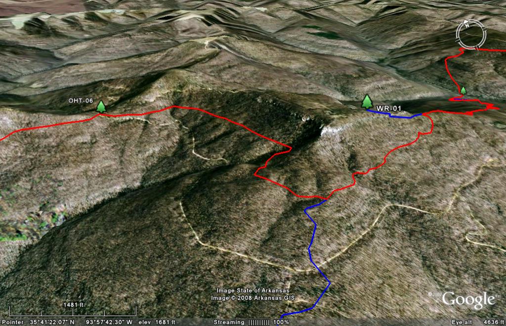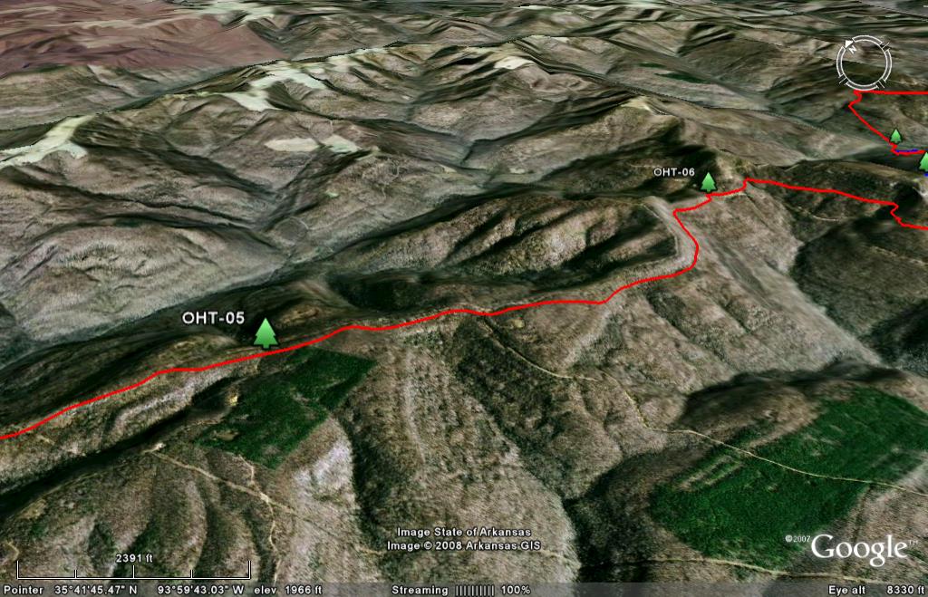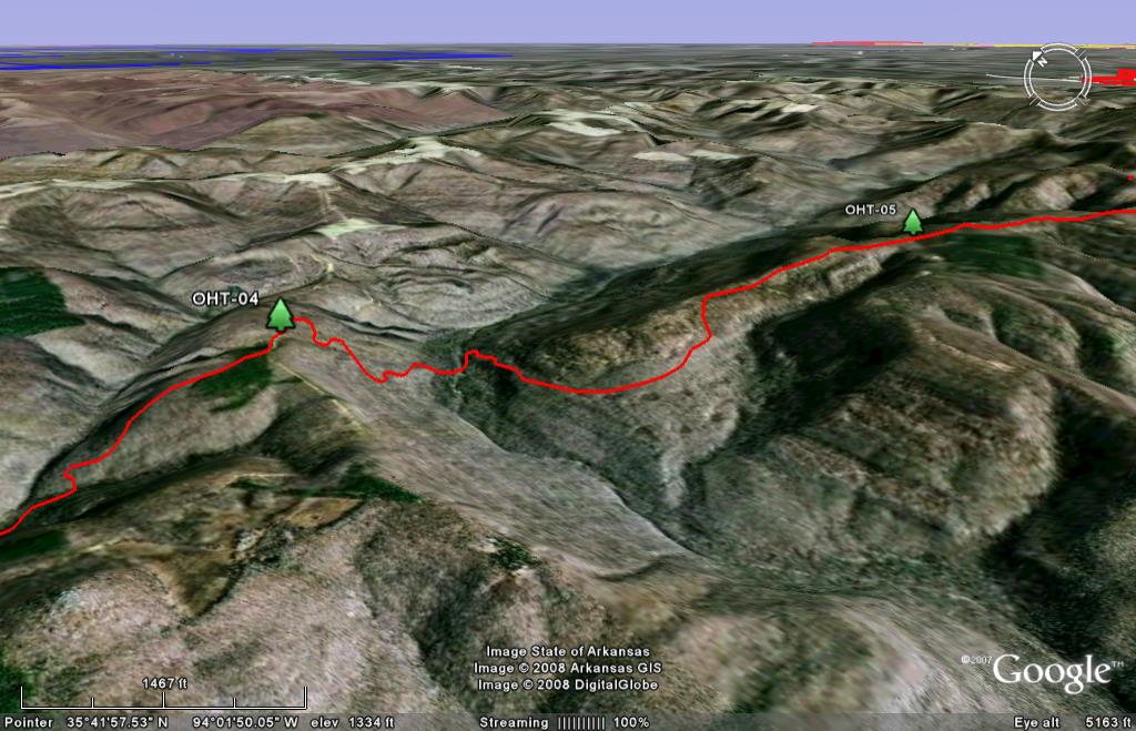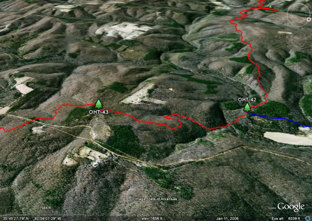 The maps have been updated since I first posted them in January 2008. I have re-GPSed the trail from Lake Fort Smith to Woolum and added the trail description pages. I was foiled by highwater so the 1.4 mile section between Ben Hur and the Richland Creek crossing is based Eric Strong’s 2004 GPS track and Google Earth. Because of the scale of these maps and GPS data, they are the most accurate maps available for the trail. I hope you find these useful for your next trip to the Ozarks.