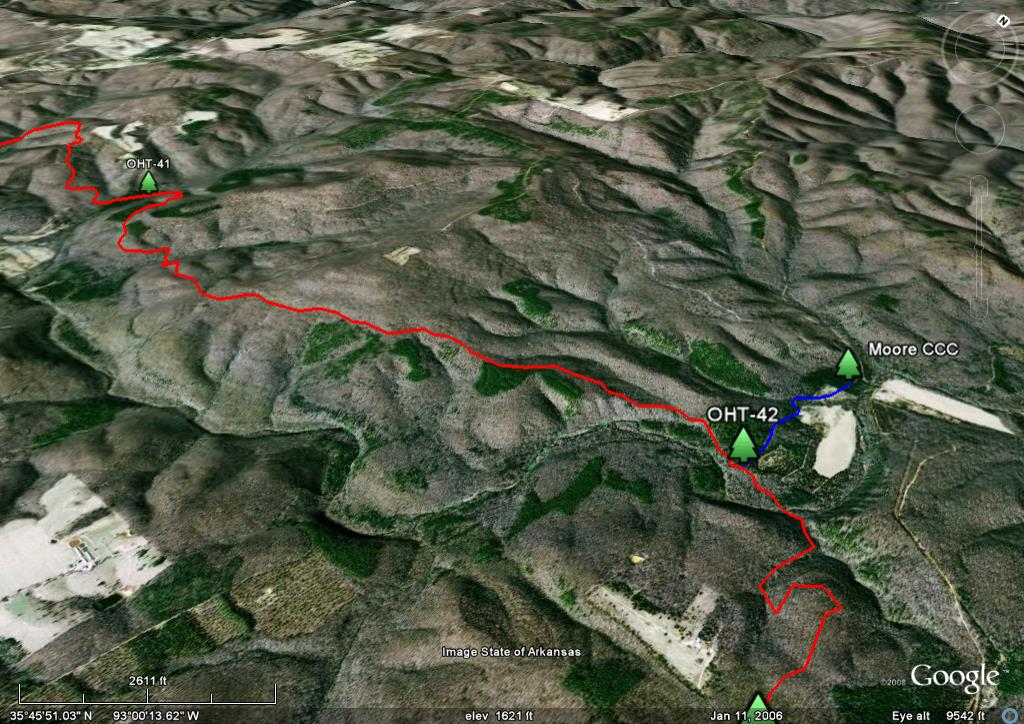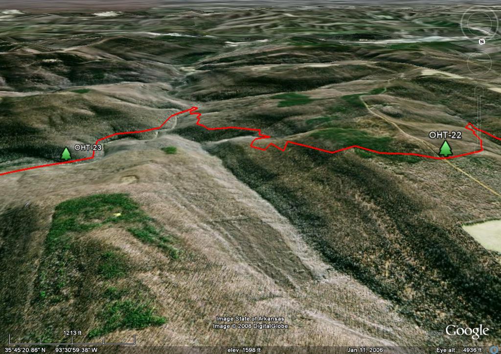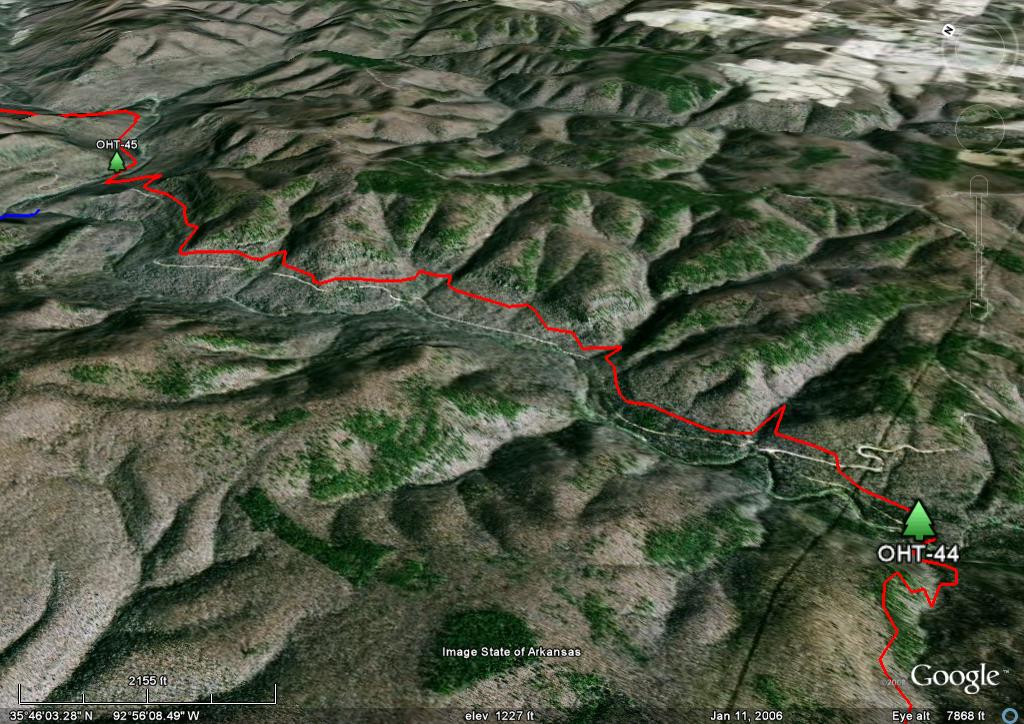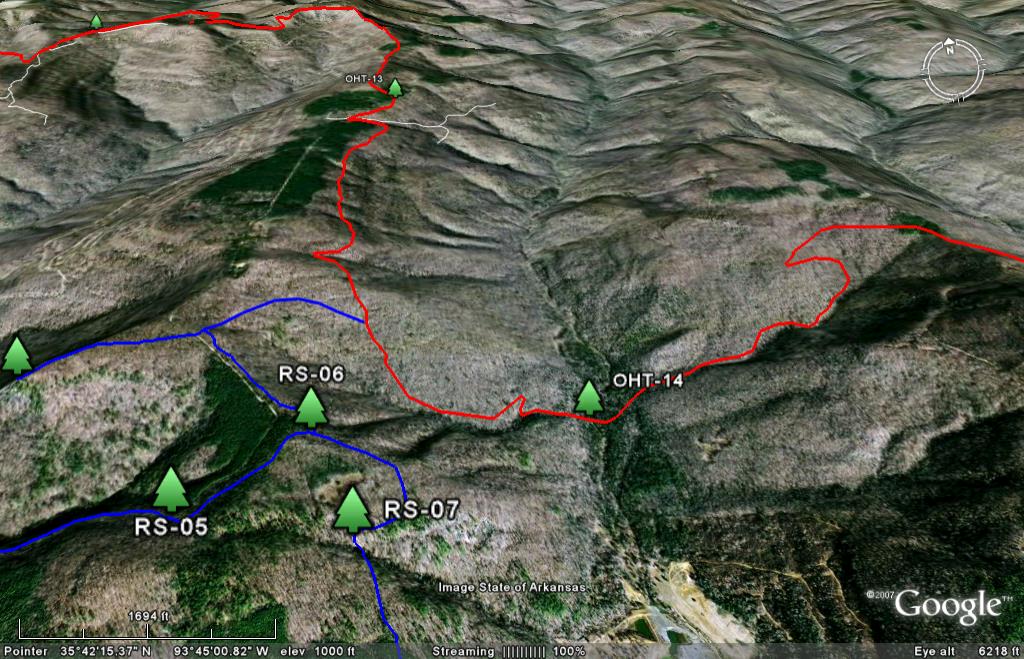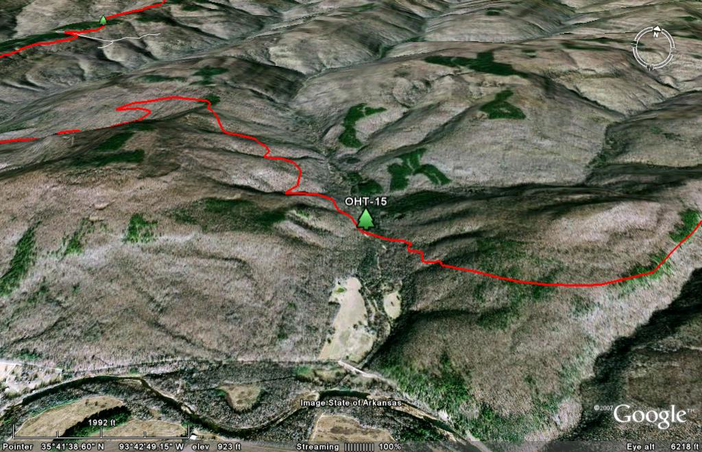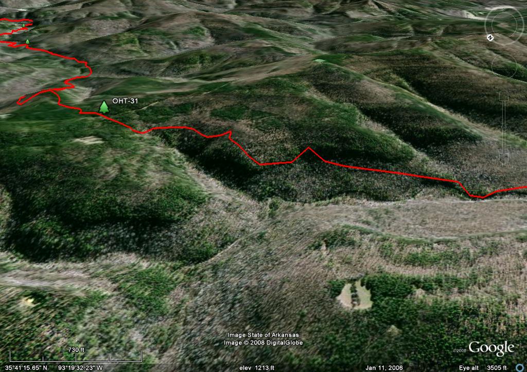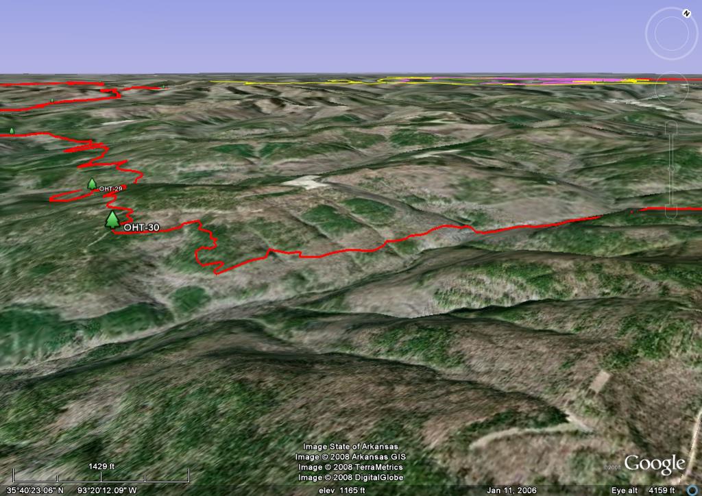 The maps have been updated since I first posted them in January 2008. I have re-GPSed the trail from Lake Fort Smith to Woolum and added the trail description pages. I was foiled by highwater so the 1.4 mile section between Ben Hur and the Richland Creek crossing is based Eric Strong’s 2004 GPS track and Google Earth. Because of the scale of these maps and GPS data, they are the most accurate maps available for the trail. I hope you find these useful for your next trip to the Ozarks.