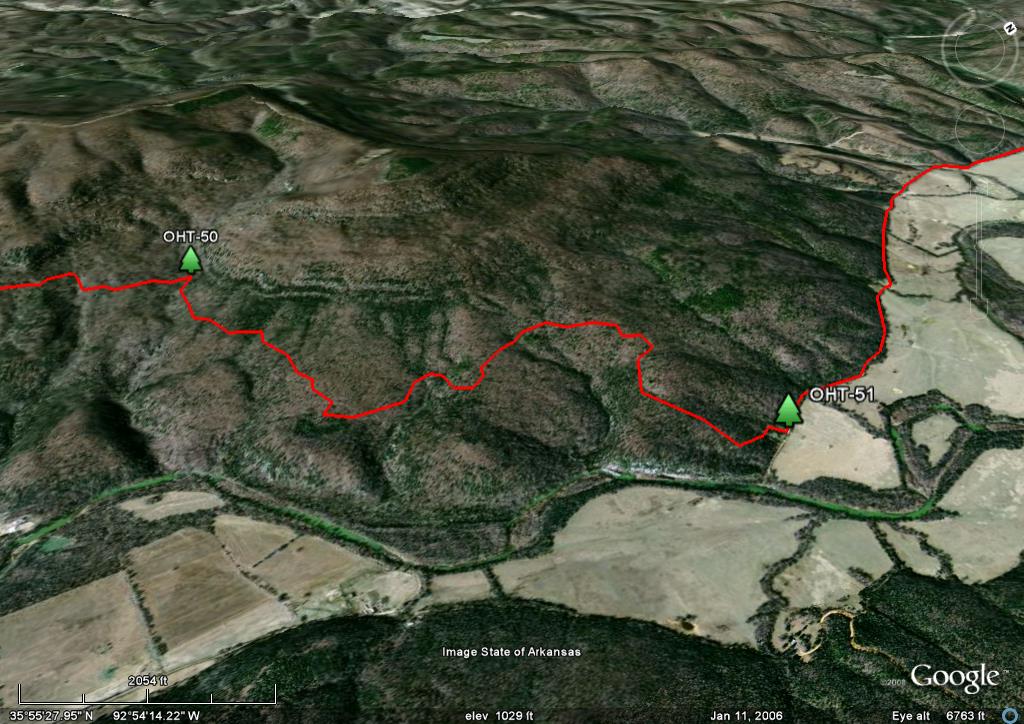 Making it up at the other end is the east section of the Buffalo River Trail and the new Sylamore Section of the OHT. The east section of the BRT is dozens of miles from the terminous of the west section at Pruitt AR but it is mainly in the boundary of the Buffalo National River. The original 165 miles of the OHT ends at Woolum, where the east BRT begins. As a consequnce the east BRT is also cnsidered part of the OHT. No matter the name, the east BRT runs another 15 miles to the US Highway 65 bridge across the Buffalo River.