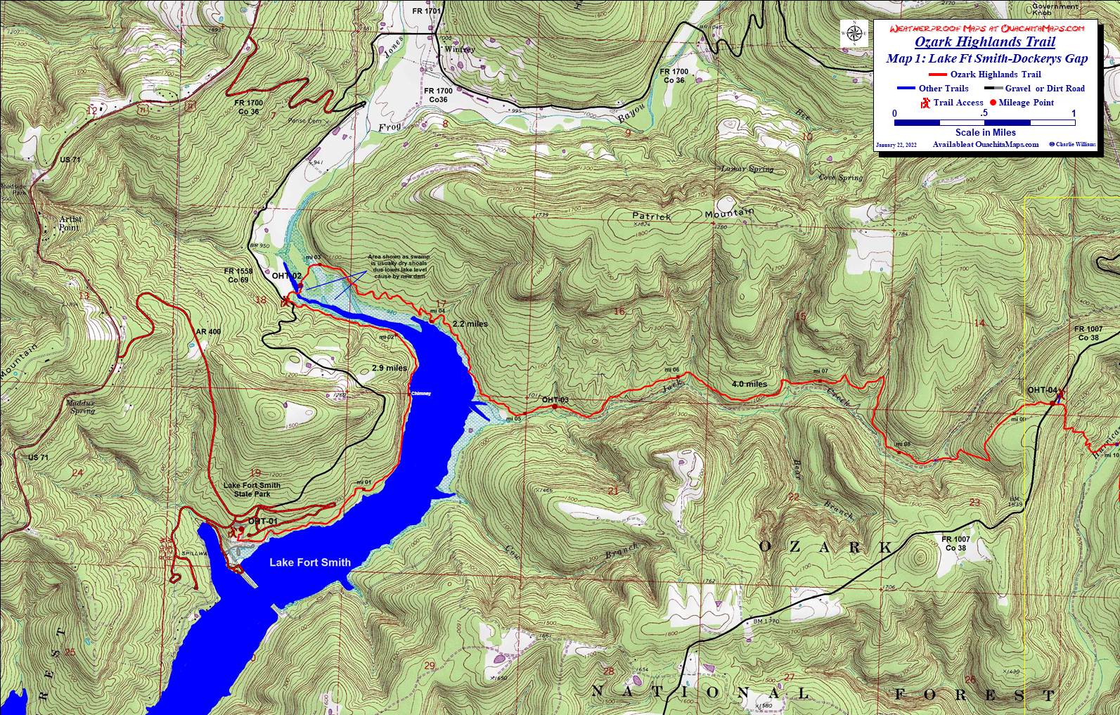 Background. It used to be said that the Ozark Highlands Trail (OHT) was 165 miles long, stretching from Lake Fort Smith State Park to Woolum Ford on the Buffalo River. Now it is a little more complicated. First, on the west end Lake Fort Smith and Shepherd Lake were combined into one, Lake Fort Smith State Park was moved 4 miles north and the old trail was flooded. A new trail section connects the new park with the existing trail in Jacks Creek. According to the GPS track we took April 17 2009, it is a mile shorter.