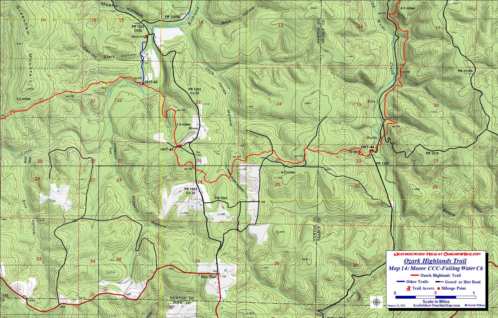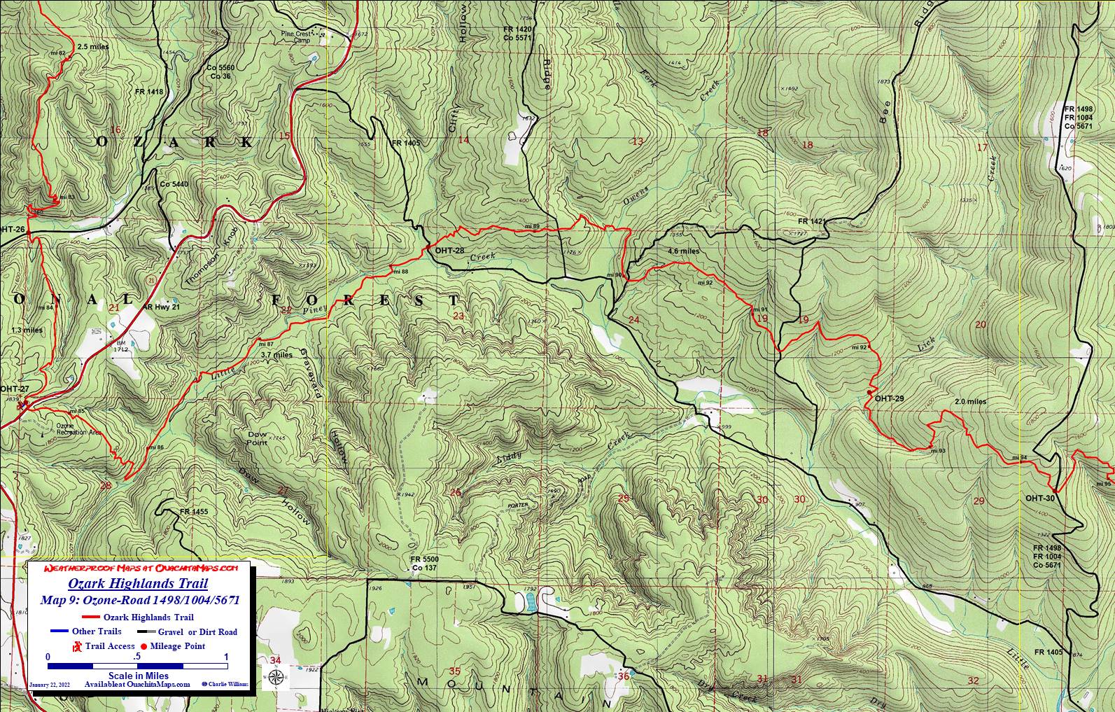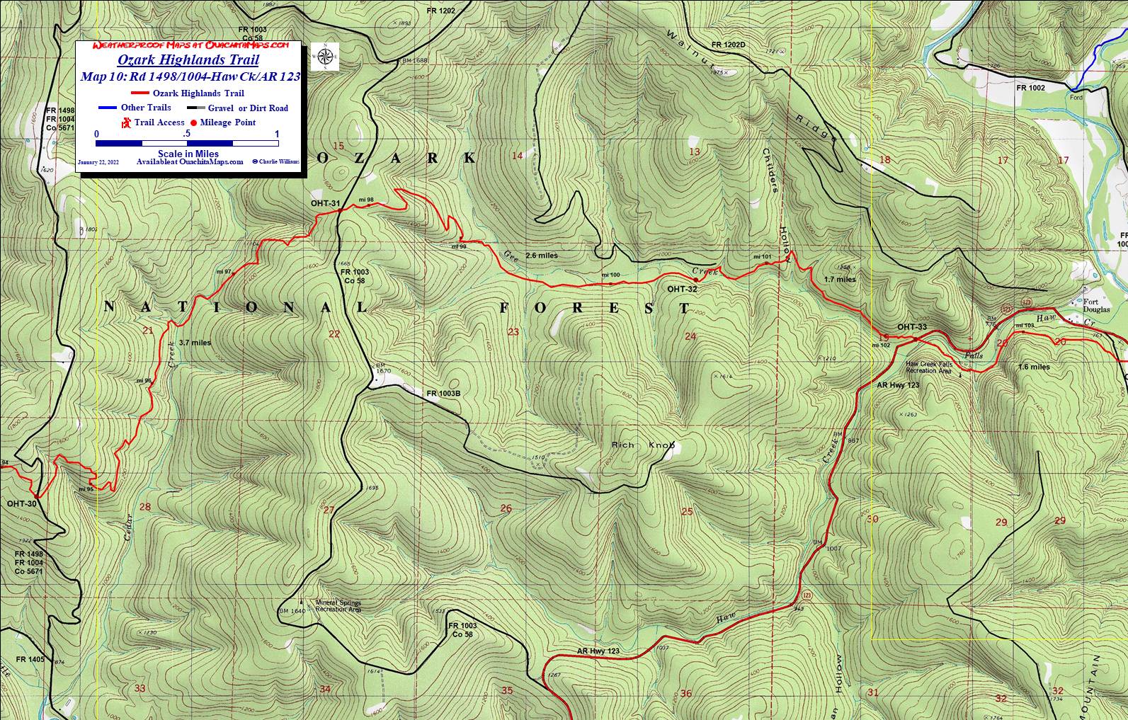 The base maps are a composite of USGS topos. The OHT is shown in red and other trails are shown in blue. Mileages between waypoints are provided and are based on the offical distances between mile markers. The forest roads have been enhanced and updated using aerial photos, satellite imagery and the 2005 Ozark National Forest map. Many different road designations are shown because they have different names on different maps: Some are forest roads, some county roads and some are local names.