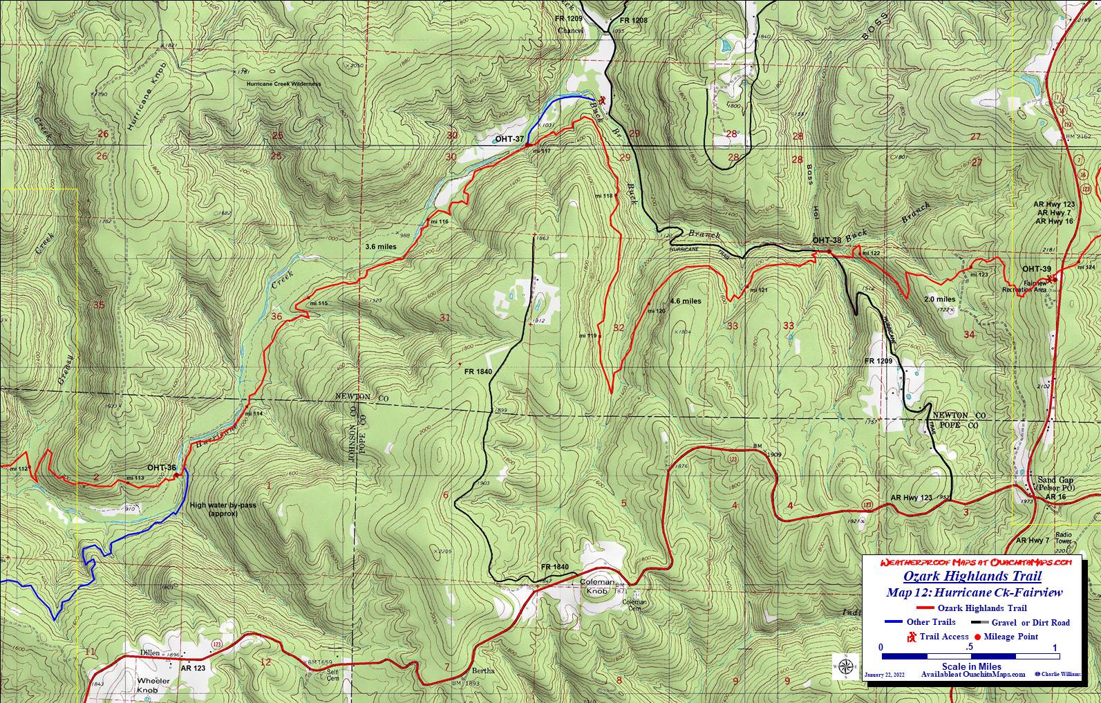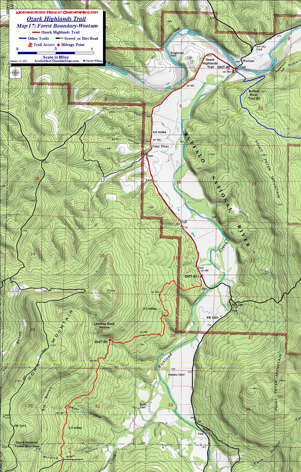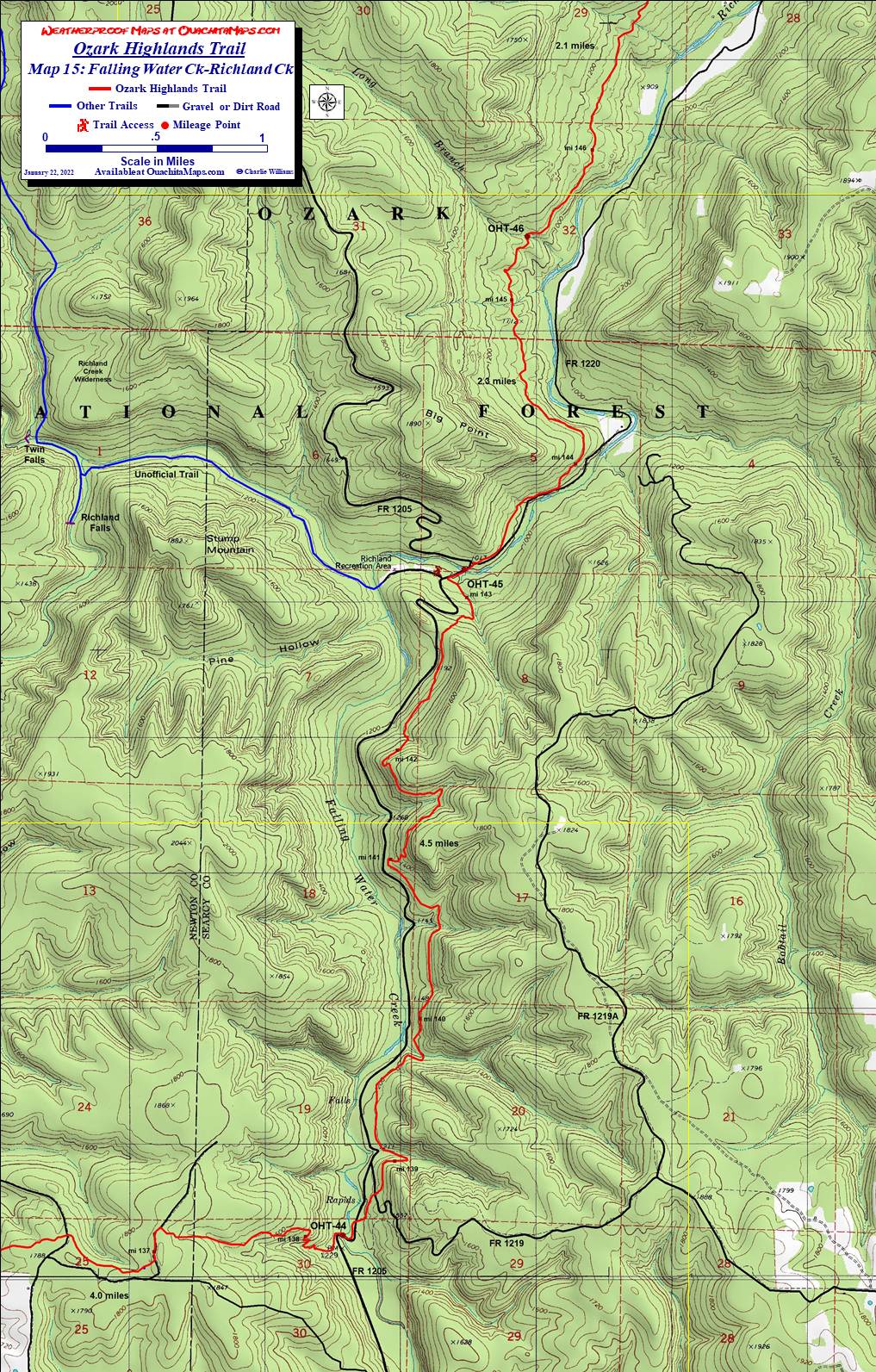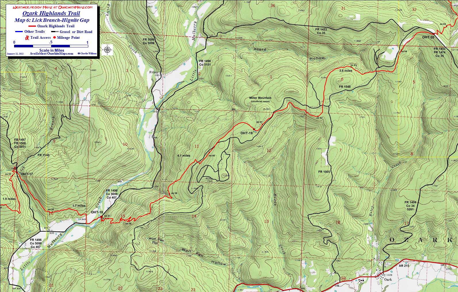 The base maps are a composite of USGS topos. The OHT is shown in red and other trails are shown in blue. Mileages between waypoints are provided and are based on the offical distances between mile markers. The forest roads have been enhanced and updated using aerial photos, satellite imagery and the 2005 Ozark National Forest map. Many different road designations are shown because they have different names on different maps: Some are forest roads, some county roads and some are local names.