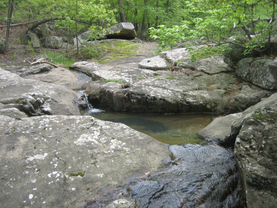 About 0.15 miles into the woods there appears to be a reroute. You will see a creek bed in front and a trail going left. Go left. You'll run into the trail that followed the creek in a few hundred feet. According to a sign along the trail, the Butterfield Stage used to run through this area. (I'd love to see some data on that because everything I can find indicates the stage route went through Wilburton.) The trail meanders through the woods, crosses a gully at mile 1.7 and crosses Coon Creek at mile 1.9. At this point you will be on a road trace. At mile 2.0 on your left there will be a flat sandstone outcrop forming a ledge next to a small lake (RC-04). There is a blaze on the other side but it is not obvious. However, if you miss the turn, a few hundred feet up the road trace is a building and dam on the left next to the lake. If you see it, you went too far.
