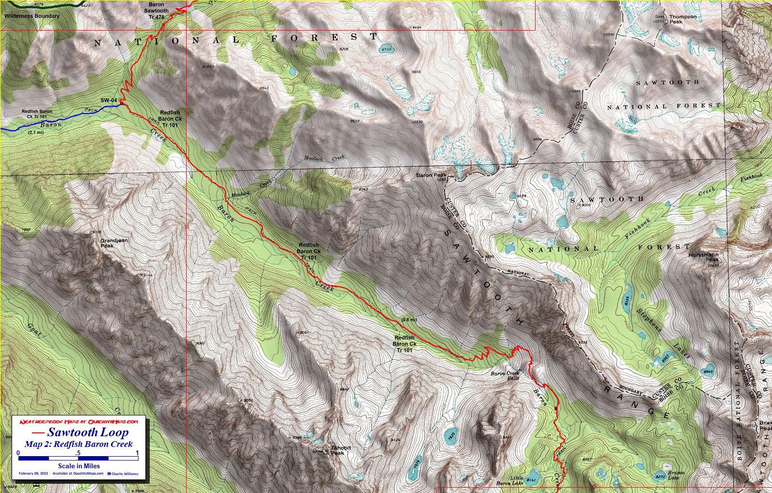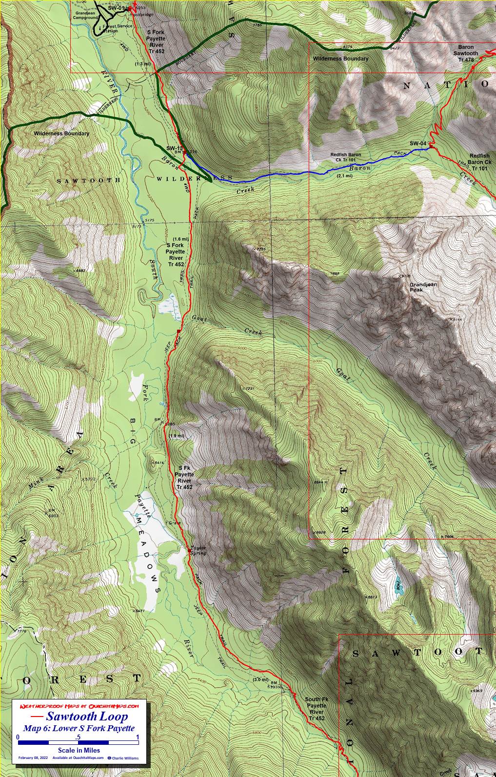 Map 4: Ardeth-Ten Basin-Benedict. The Mt Cramer Trail leaves Hidden Lake and switchbacks down to the SW-06 in the valley of the South Fork of the Payette River. SW-06 is 36.6 miles into the loop. The loop turns south-southeast (left) and follows the S Fk Payette River Trail (452. The trail is blue on the map but where it coincides with the loop, the red loop line makes it purple). Turning west (right) at the junction will lead to SW-12 in 3 miles, cutting 14 miles off from the loop.
