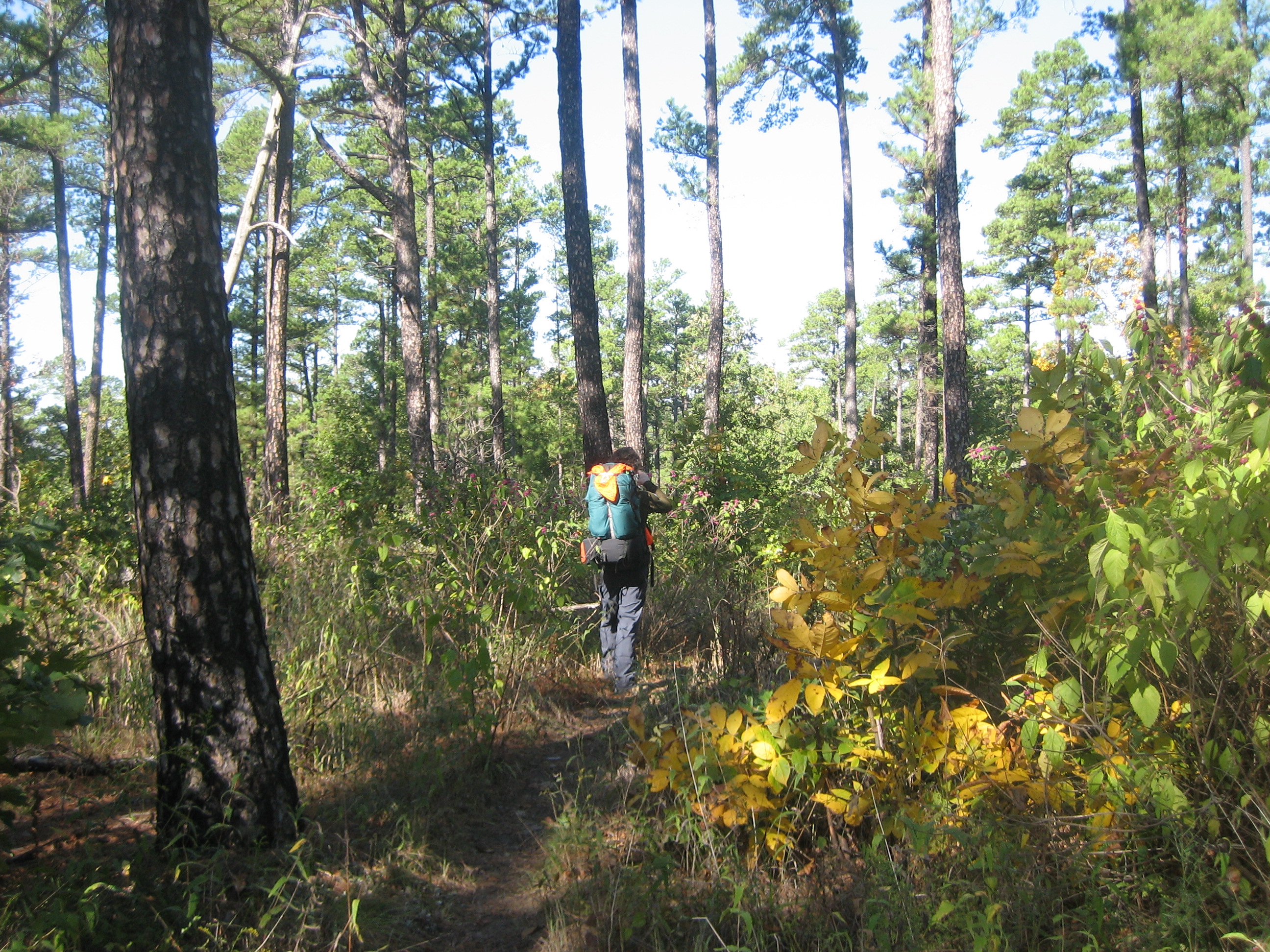 Like the Boardstand Trail, this loop starts at Talimena State Park and uses the first section of the Ouachita Trail in Oklahoma. However, instead of coming back through Holson Valley, it drops south along the Bohannon Trail and returns to the park along the little used Choctaw Nation Trail (formerly Indian Nation Trail, INT). The trip is about 17 miles.